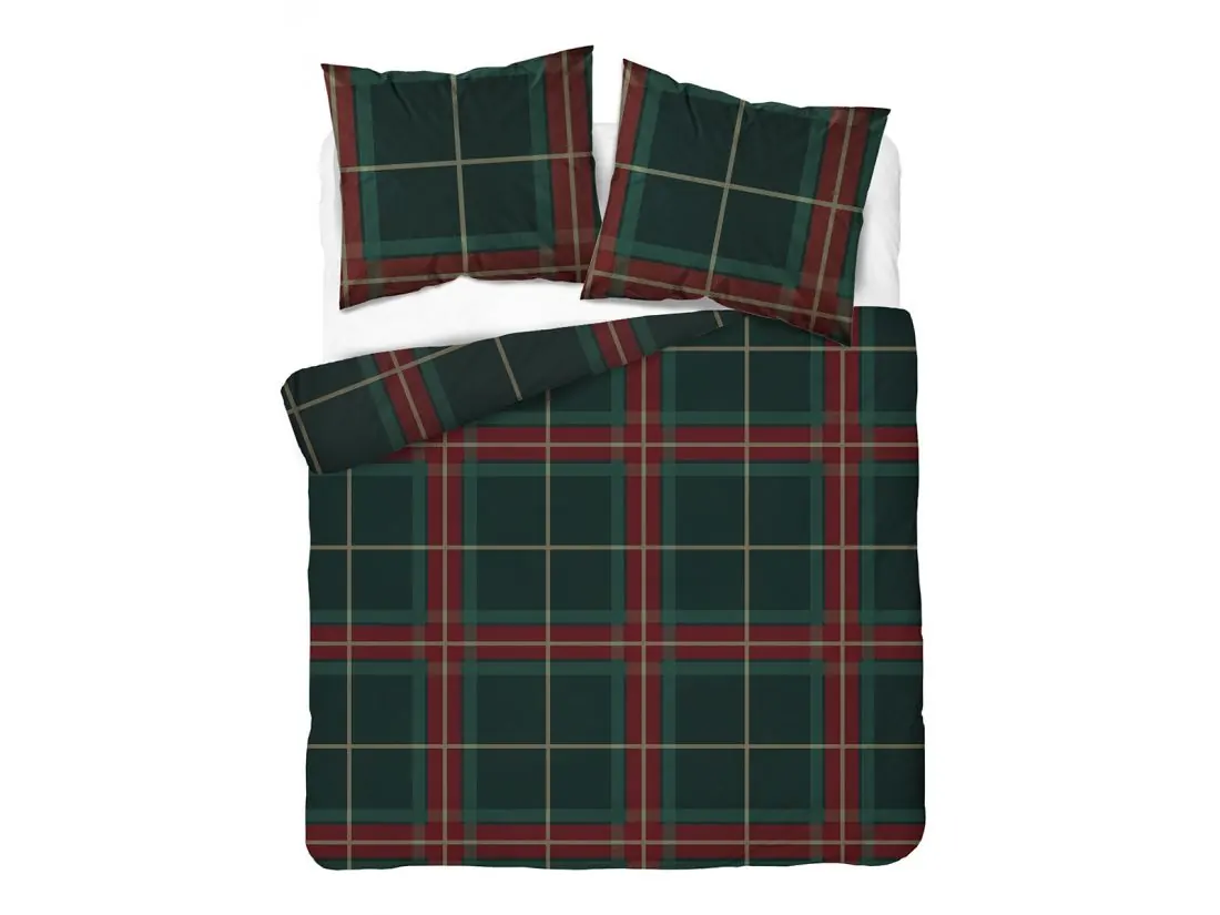 Wzór pościeli przedstawiony na zdjęciu to klasyczna, elegancka krata w stylu szkockim (tartan). Dominują ciemnozielone i bordowe pasy, które przecinają się pod kątem prostym, tworząc duże kwadraty na całej powierzchni poszwy oraz poduszek. Dodatkowo wzór uzupełniają cienkie linie w beżowym kolorze, nadające całości geometryczną precyzję oraz ponadczasowy, wyrazisty wygląd.