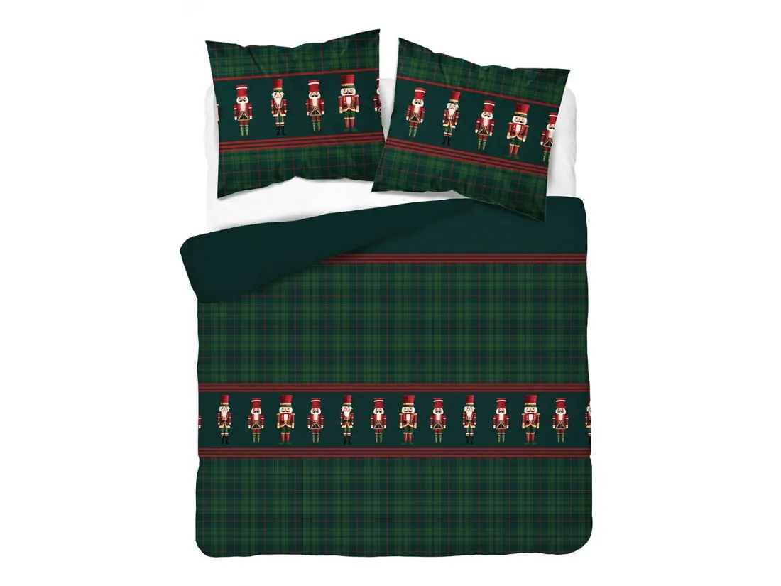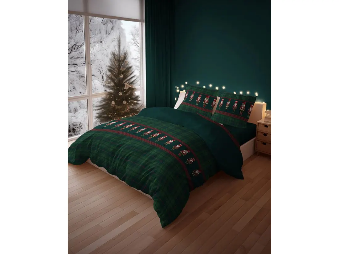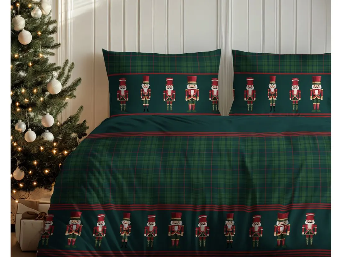 Pościel w klasyczną szkocką kratę z zielonymi tonacjami i czerwonymi akcentami wraz z motywem zabawnych dziadków do orzechów doskonale wkomponuje się w świąteczny wystrój sypialni. Wprowadza ciepłą, przytulną atmosferę idealną na zimowe i świąteczne dni.