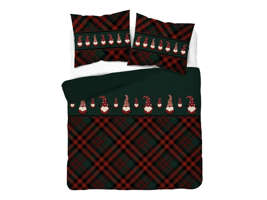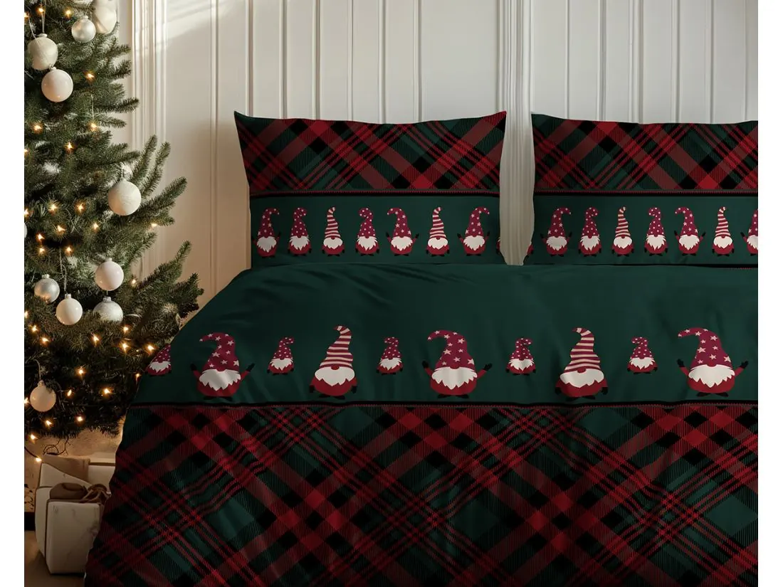 Wzór pościeli to klasyczna tartanowa krata w ciemnozielonych i bordowych kolorach, obecna zarówno na poduszkach jak i kołdrze, tworząca przytulny, geometryczny efekt. Centralnym elementem dekoracyjnym jest szeroki pas z urokliwymi krasnalami z długimi brodami i wysokimi czapkami zdobionymi gwiazdami i paskami. Krasnale, rozmieszczone na tle ciemnej zieleni i otoczone czerwonymi liniami, wprowadzają radosny i zimowy charakter zestawu.