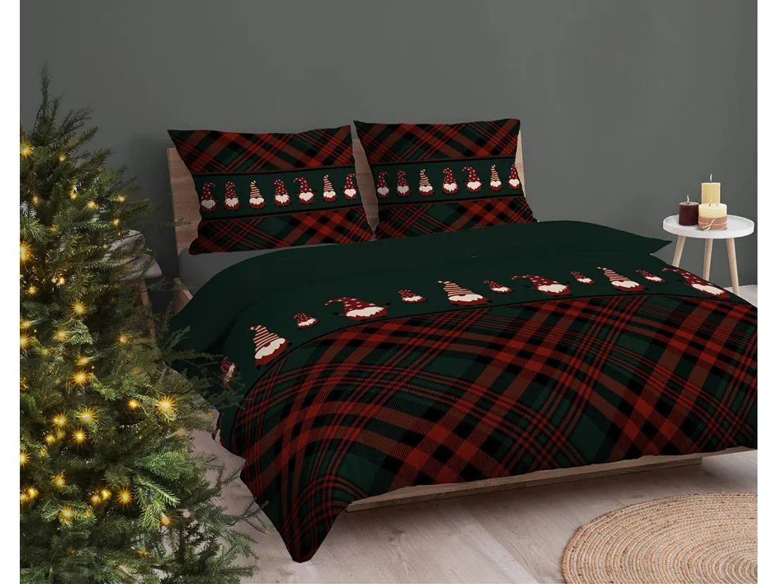 Pościel świąteczna 160x200 krata ciemnozielona bordowa z krasnalami