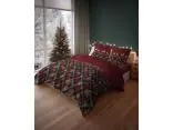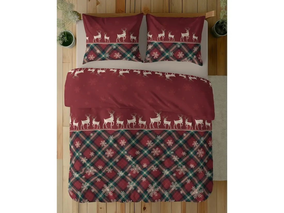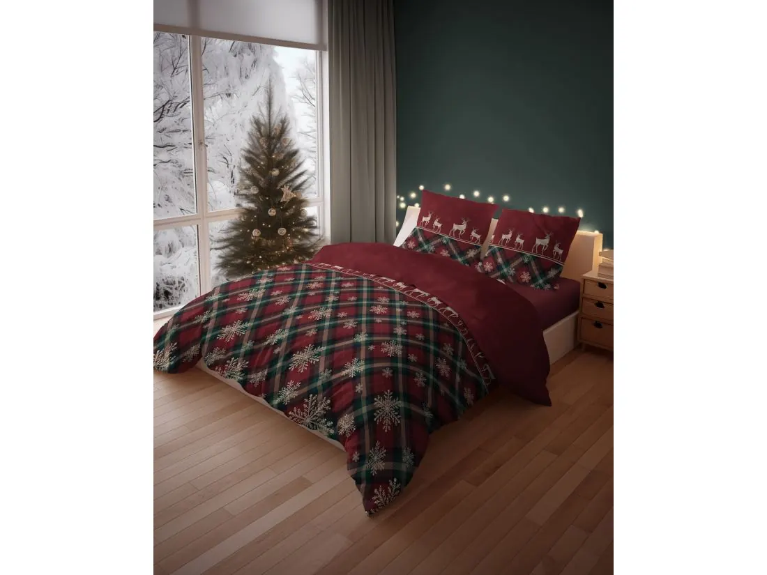 Wzór pościeli przywołuje rodzinny, świąteczny klimat dzięki głębokim odcieniom zieleni i bordowym akcentom, wzbogaconym delikatnymi złotymi detalami. Na poszewkach i kołdrze znajdują się złote sylwetki reniferów, rozmieszczone w dynamiczny sposób, uzupełnione subtelnymi śnieżynkami, które wzmacniają atmosferę zimowych świąt. Centralną część zdobią duże, ciemne wzory śnieżynek na zielonym tle, co podkreśla elegancję całego zestawu.