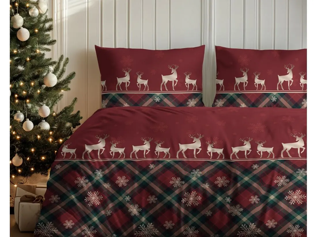 Pościel bawełniana świąteczna 160x200 + 2x70x80 – klasyczny wzór z reniferami i śnieżynkami