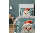 Centralnym motywem kołdry jest uśmiechnięty, kreskówkowy Mikołaj z dużą białą brodą, różowym nosem i rumianymi policzkami, ubrany w czerwony strój i czapkę z białym pomponem. Wokół postaci znajdują się ośnieżone gałęzie iglaków oraz śnieżynki w różnych rozmiarach i odcieniach błękitu, które tworzą zimowy, bajkowy klimat.