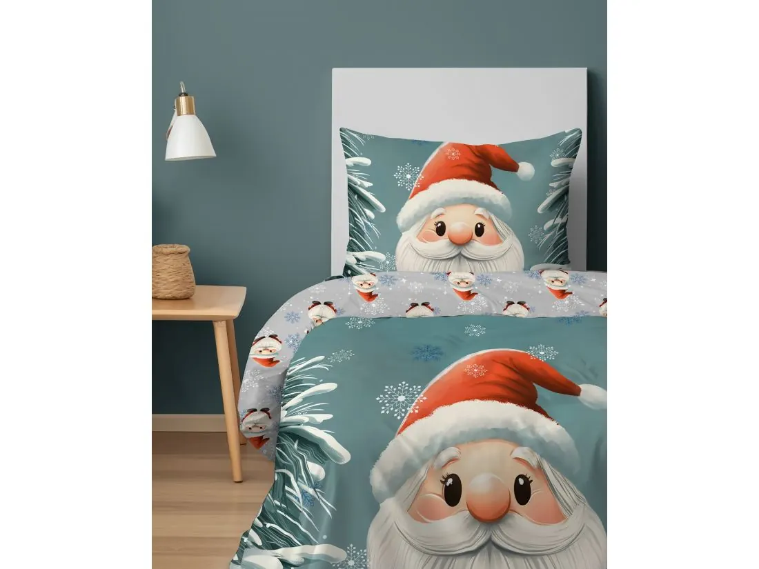 Poszewka na poduszkę powtarza motyw Mikołaja wśród ośnieżonych gałęzi. Odwrotna strona pościeli pokryta jest drobnym, powtarzalnym wzorem Mikołaja i śnieżynek na jasnoszarym tle, co zapewnia spójność i lekkość kompozycji.