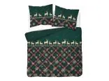 Wzór pościeli idealnie wpisuje się w świąteczny klimat. Górna część poszwy oraz poduszki zdobi głęboki, ciemnozielony kolor z subtelnymi śnieżynkami, które nadają całości elegancji i zimowego uroku. Centralny motyw tworzy pas kremowych sylwetek reniferów o różnych wielkościach i kształtach poroża, co wprowadza ciepły, leśny nastrój charakterystyczny dla zimowych dekoracji w stylu skandynawskim.