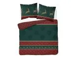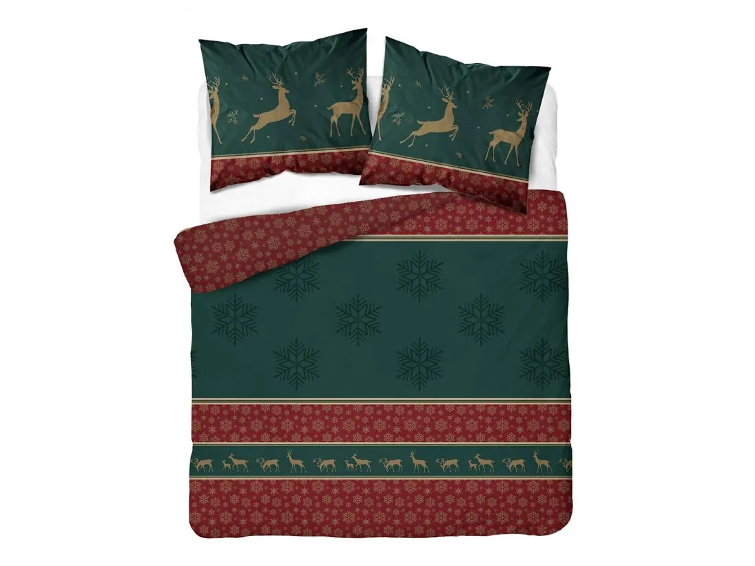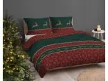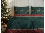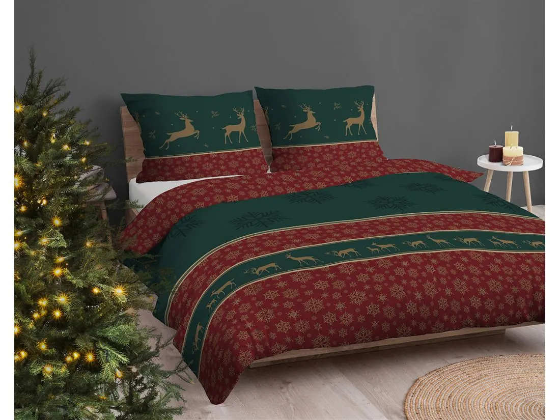 Wzór pościeli przywołuje rodzinny, świąteczny klimat dzięki głębokim odcieniom zieleni i bordowym akcentom, wzbogaconym delikatnymi złotymi detalami. Na poszewkach i kołdrze znajdują się złote sylwetki reniferów, rozmieszczone w dynamiczny sposób, uzupełnione subtelnymi śnieżynkami, które wzmacniają atmosferę zimowych świąt. Centralną część zdobią duże, ciemne wzory śnieżynek na zielonym tle, co podkreśla elegancję całego zestawu.