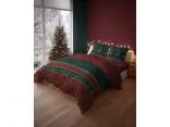Bordowe pasy z ornamentami można znaleźć zarówno na poduszkach, jak i na dole kołdry, uzupełnione delikatnym wzorem śnieżynek oraz złotych linii. To zestawienie kolorów i wzorów tworzy nastrojową, ale jednocześnie elegancką dekorację, która doskonale wpisuje się w klimat świąt i wnosi do sypialni przytulność.
