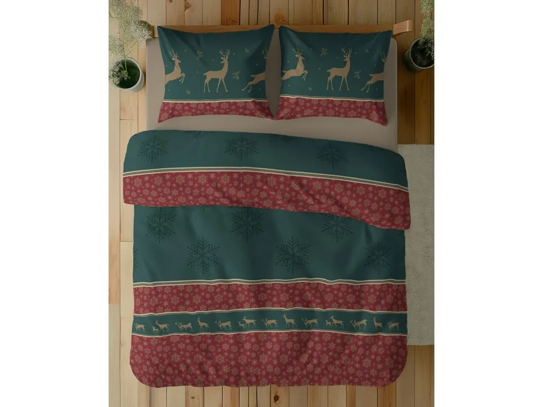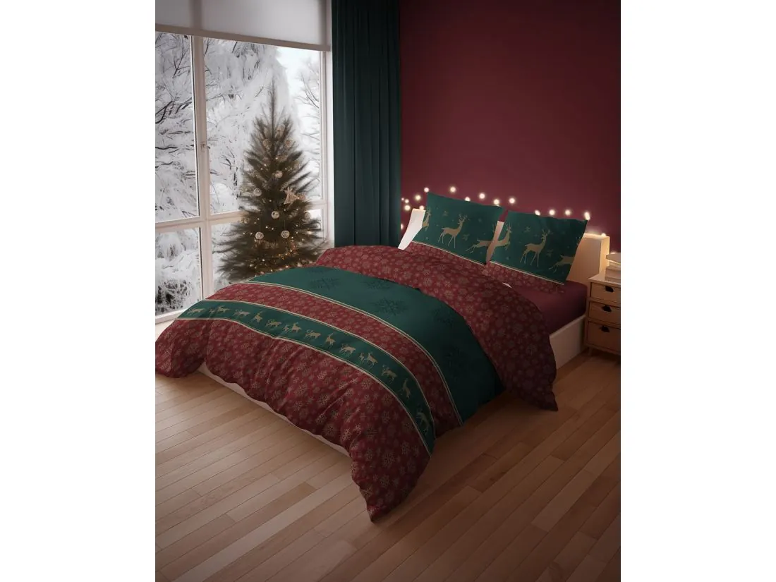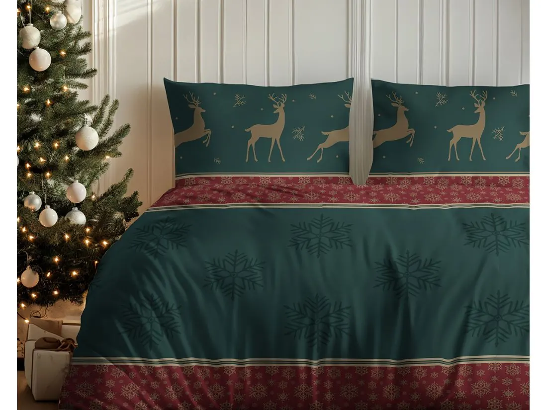 Wzór pościeli przywołuje rodzinny, świąteczny klimat dzięki głębokim odcieniom zieleni przełamanym bordowymi akcentami i delikatnymi złotymi detalami. Na poszewkach i kołdrze widnieją złote sylwetki reniferów, rozmieszczone dynamicznie i uzupełnione subtelnymi motywami śnieżynek, co potęguje atmosferę zimowych świąt. Centralna część udekorowana jest dużymi, ciemnymi śnieżynkami na zielonym tle, podkreślając elegancję zestawu.