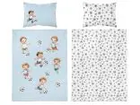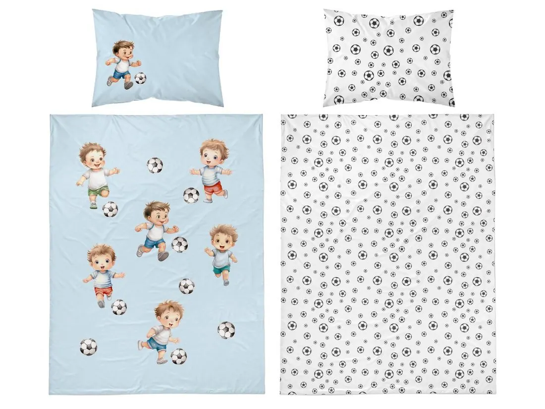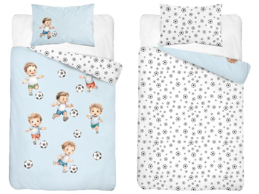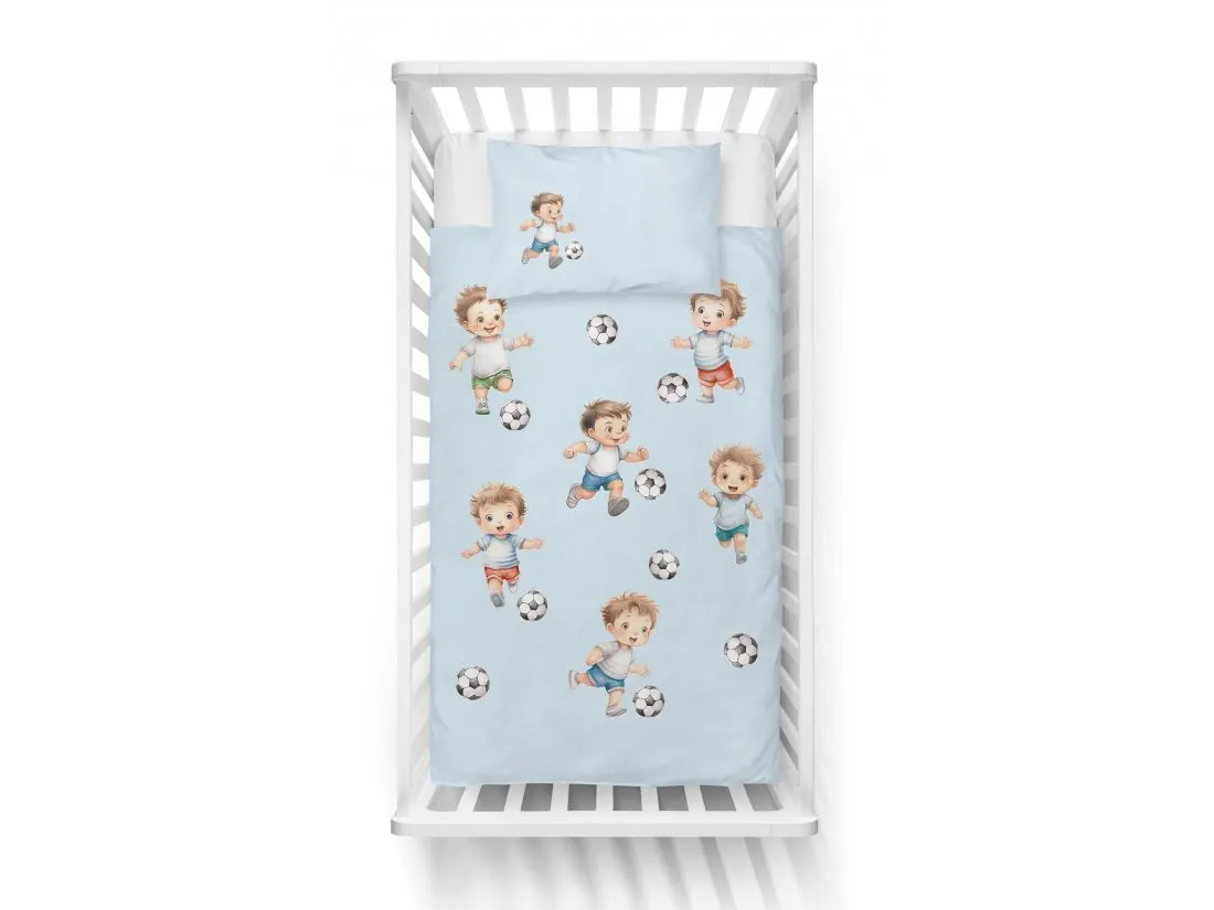 Pościel z bawełny 100x135 + 40x60 chłopczyk z piłką na niebieskim tle do łóżeczka 5142 a