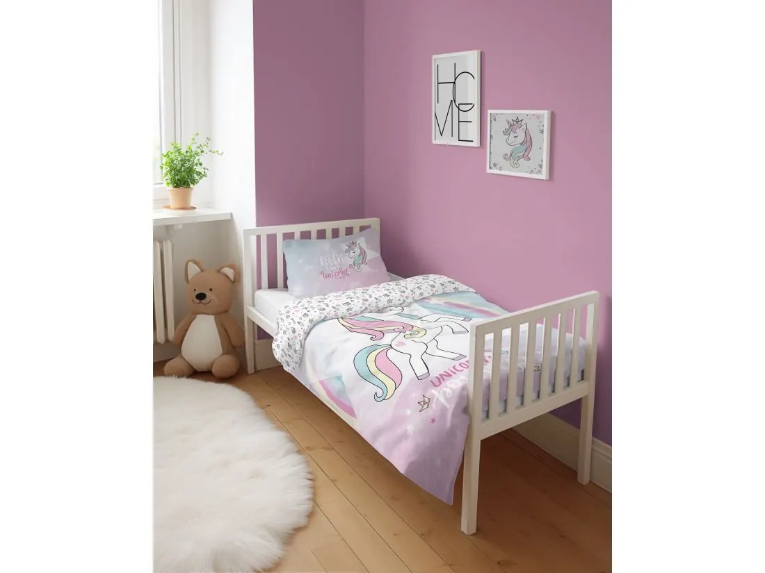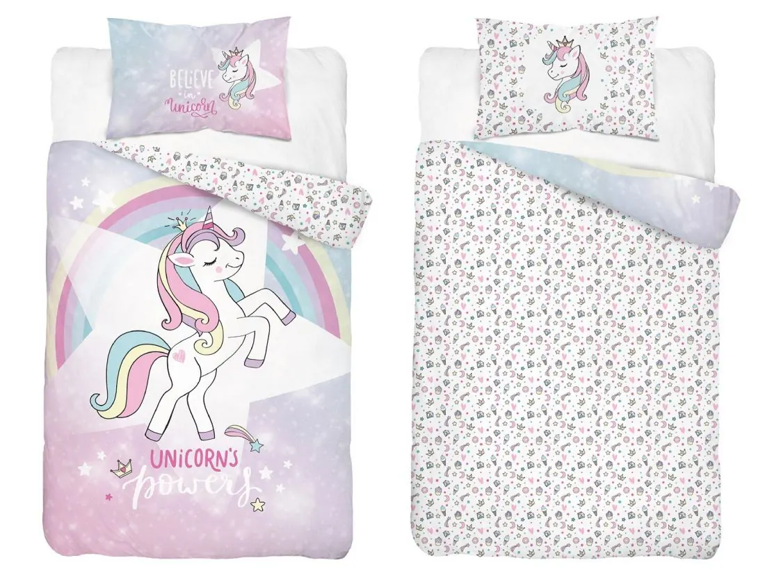 Pościel jest dwustronna – każda strona posiada inny, harmonijnie dopasowany wzór – co pozwala na szybką i łatwą zmianę aranżacji wnętrza. Praktyczne zapięcia na suwak w poszewce i poszwie ułatwiają użytkowanie i utrzymanie pościeli w czystości. Produkt posiada certyfikat Oeko-Tex, który potwierdza jego bezpieczeństwo i brak szkodliwych substancji. To doskonały wybór dla rodziców, którzy chcą połączyć funkcjonalność z estetyką i stworzyć swojej córeczce przytulne, pełne fantazji miejsce do odpoczynku.