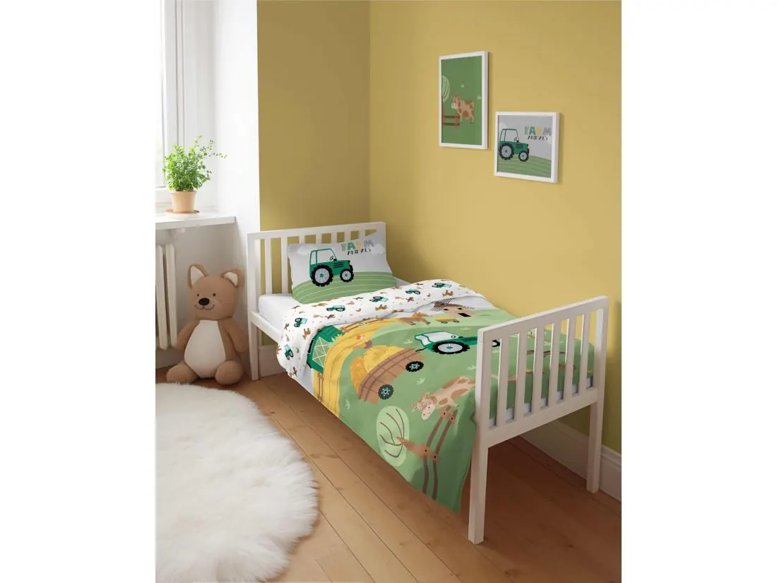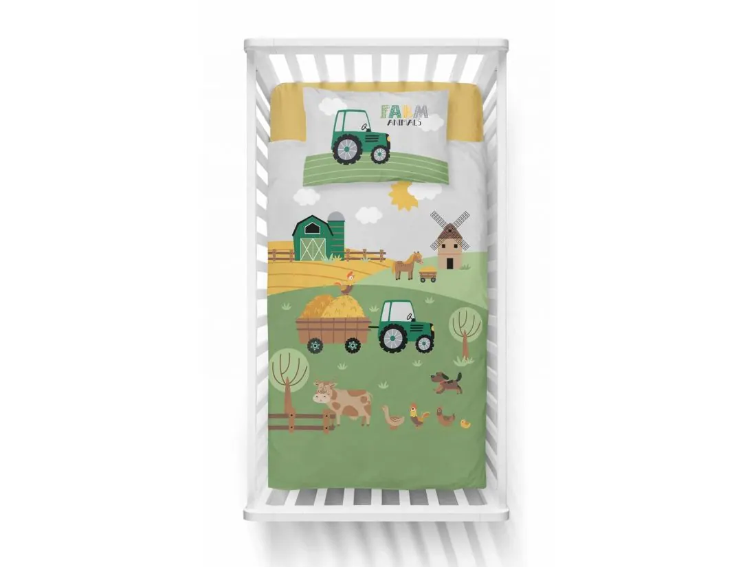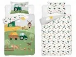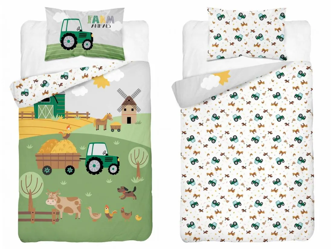 Dwustronny wzór "Wesoła Wioska" przedstawia przyjazne postacie ze świata wiejskich zwierząt: zielony traktorek, małego konika, uroczego pieska, wszystko na zielono niebieskim tle. Żywe kolory i radosne ilustracje tworzą przytulną, ciepłą atmosferę w pokoju dziecka, sprawiając, że łóżeczko nabiera wyjątkowego charakteru.
