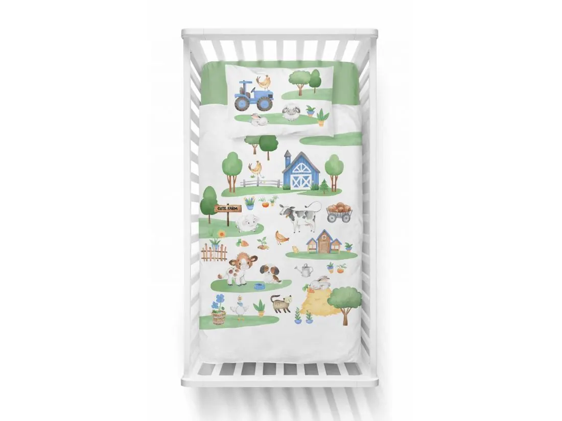 Dwustronny wzór "Wesoła Zagroda" przedstawia przyjazne postacie ze świata wiejskich zwierząt: niebieski traktorek, wesołą krówkę, puszystego baranka i uśmiechniętego kotka, wszystko na jasnym, białym tle. Żywe kolory i radosne ilustracje tworzą przytulną, ciepłą atmosferę w pokoju dziecka, sprawiając, że łóżeczko nabiera wyjątkowego charakteru.