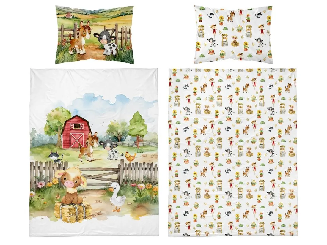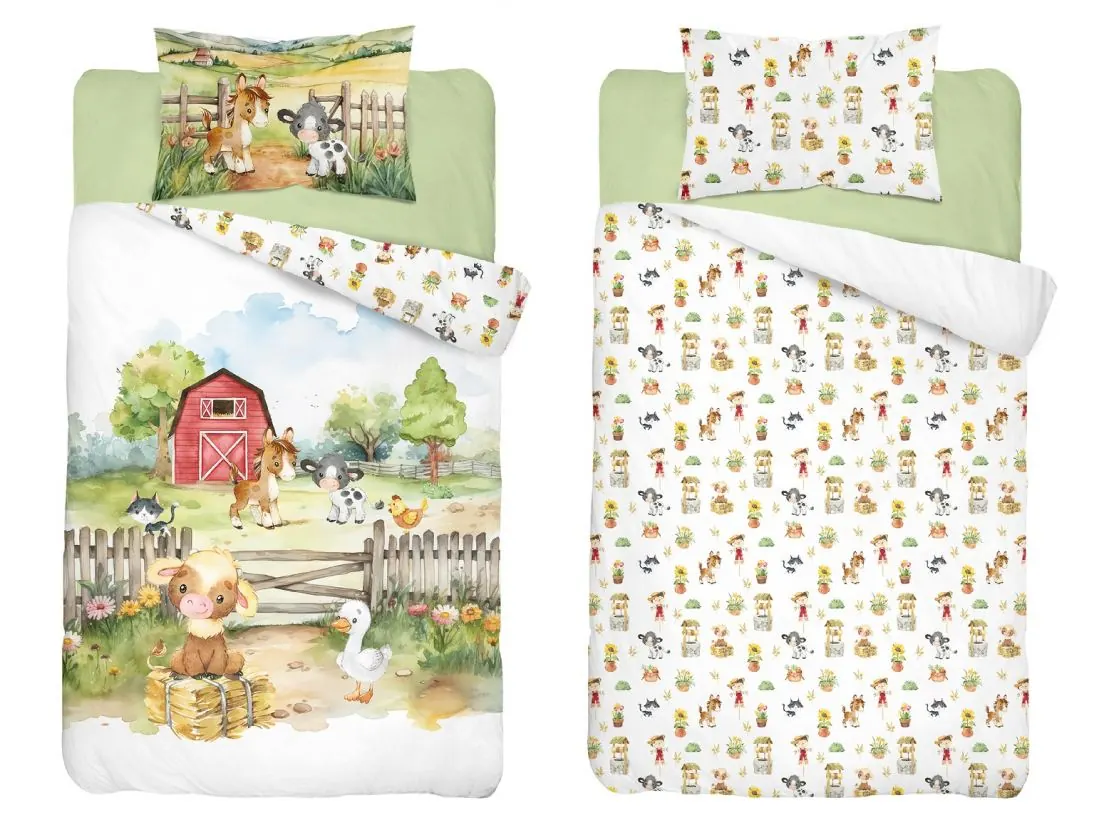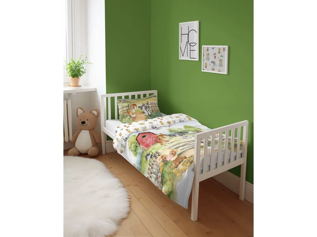 Pościel z bawełny 100x135 + 40x60 zwierzątka na farmie dla dzieci do łóżeczka 5140 a biało zielona