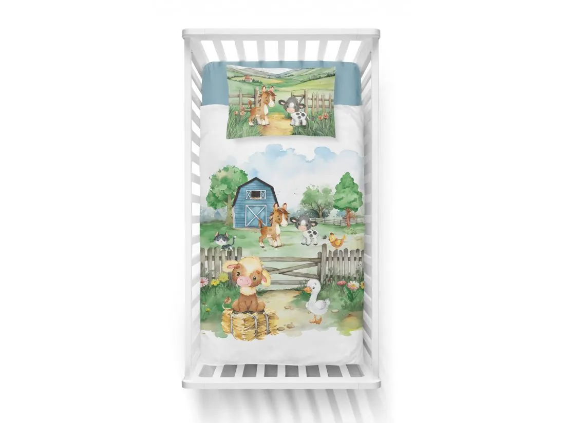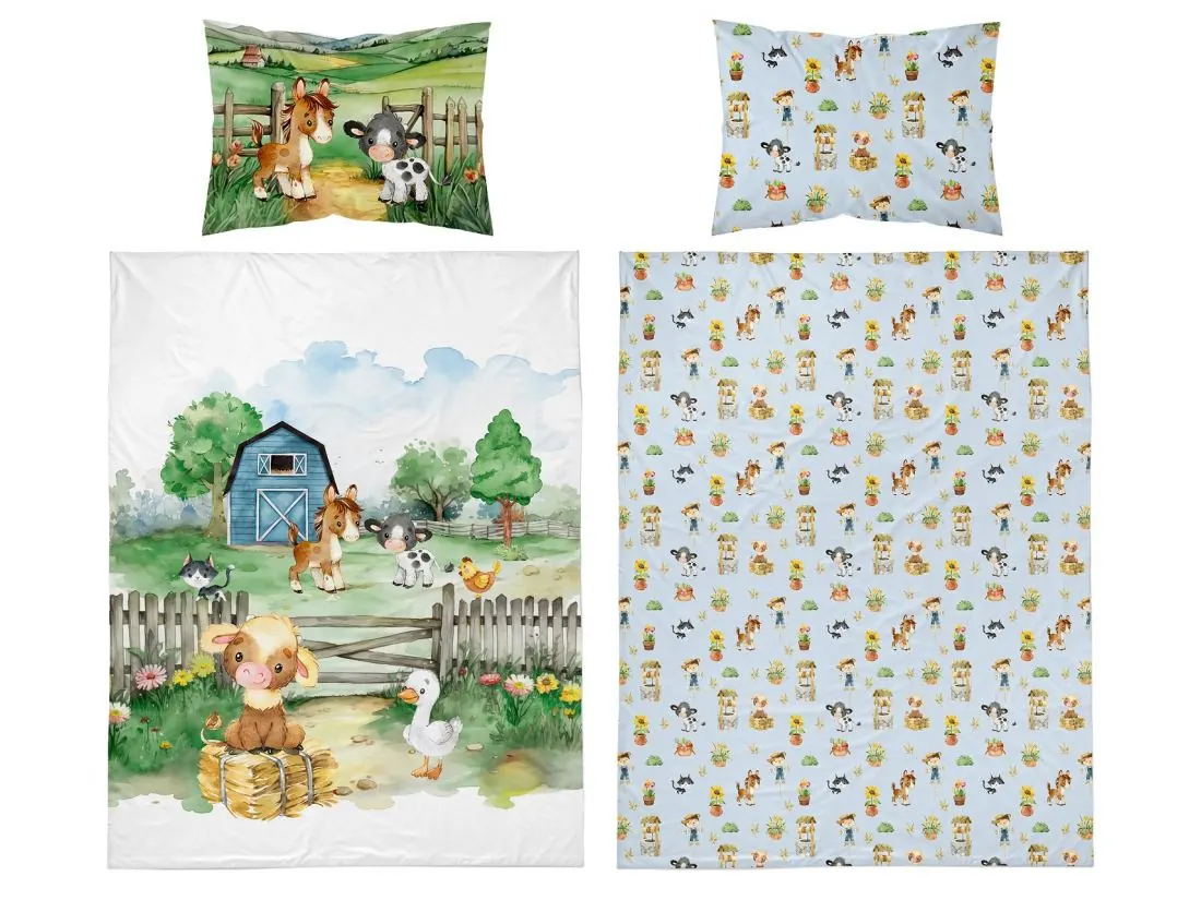 Pościel z bawełny 100x135 + 40x60 zwierzątka na farmie dla dzieci do łóżeczka 5140 b biało niebieska