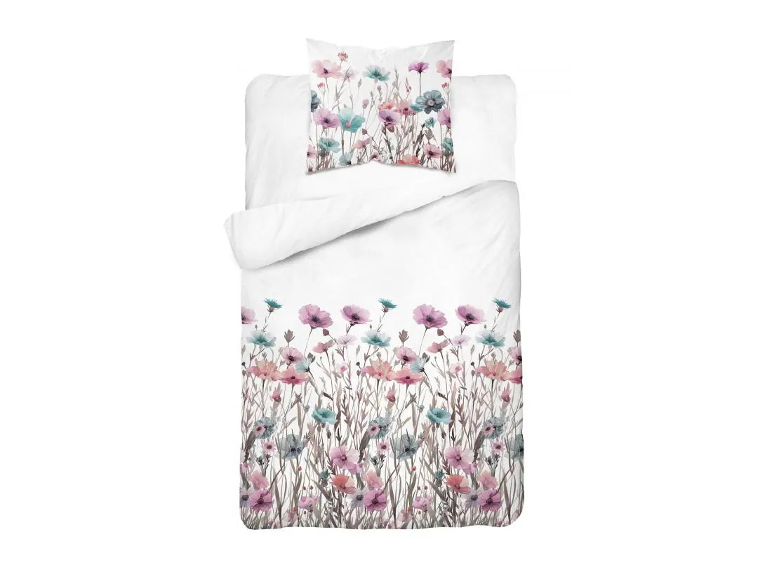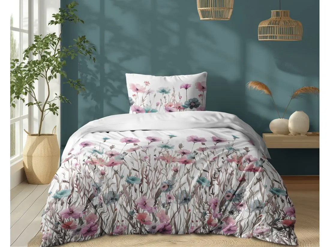 Pościel z bawełny 140x200 +1/70x80 turkusowe, różowe maki wz. 5341 b