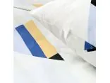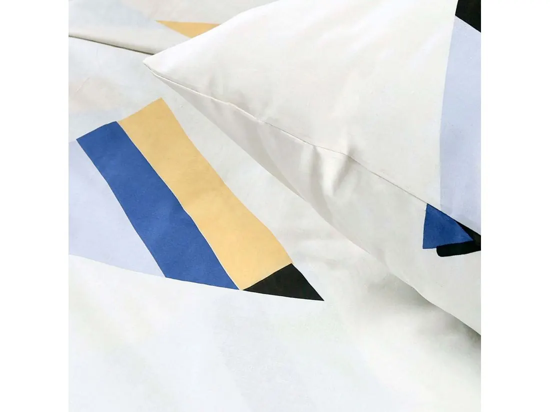 Wzór stanowi abstrakcyjną mozaikę z nachodzącymi na siebie trójkątami w kolorach: błękitnym, miętowym, żółtym, granatowym oraz czarnym. Każdy z elementów posiada delikatne cieniowanie, które nadaje całości głębi i trójwymiarowego efektu. Figury są rozproszone asymetrycznie na białej bazie, co dodaje kompozycji lekkości. Przemyślany układ sprawia, że poszewki akcentują trójkąty w części centralnej, natomiast na kołdrze motyw jest rozmieszczony dynamicznie, wprowadzając do sypialni nowoczesny design.