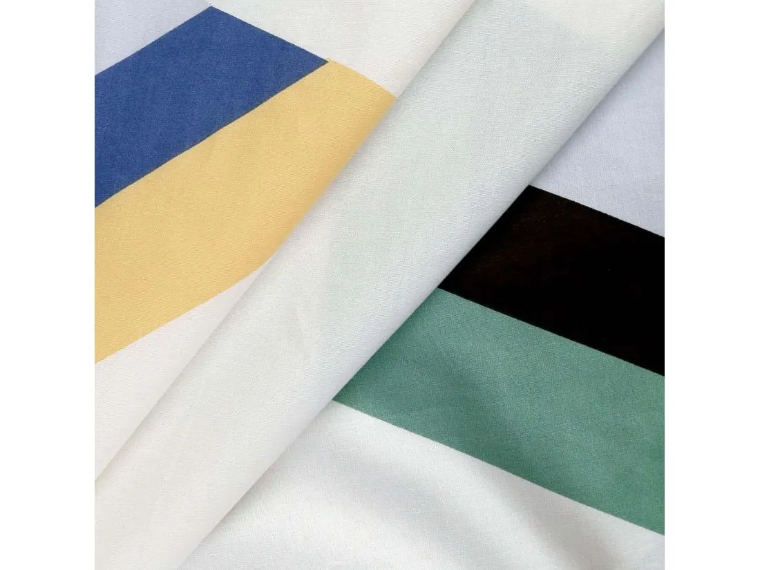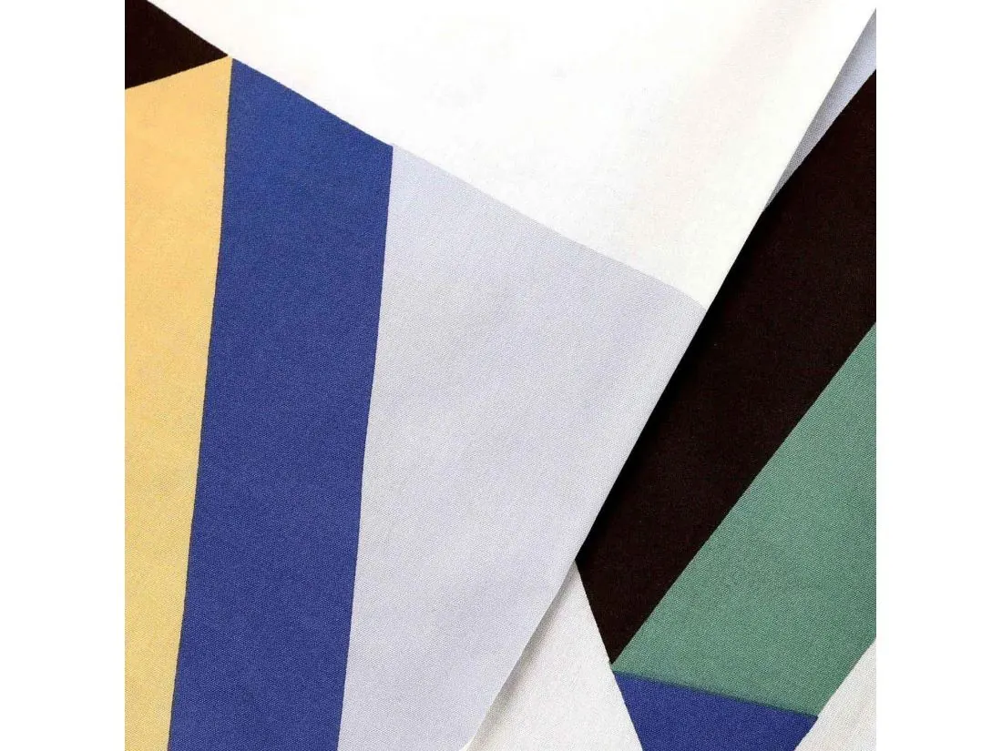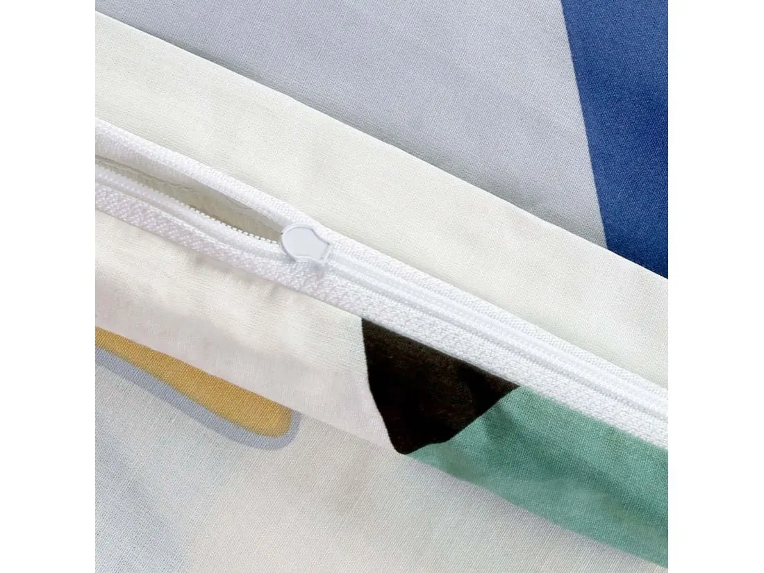 Wielobarwny nadruk daje ogromne możliwości aranżacyjne. Pościel doskonale łączy się z tekstyliami w kolorze miętowym, słonecznym żółtym lub głębokim granatem. Dla zachowania balansu i nowoczesnego looku, warto zestawić ją z jasnym prześcieradłem (białym lub jasnoszarym), które wyeksponuje geometryczny motyw jako główny punkt dekoracyjny łóżka.