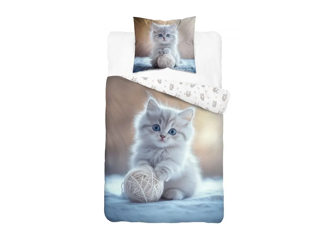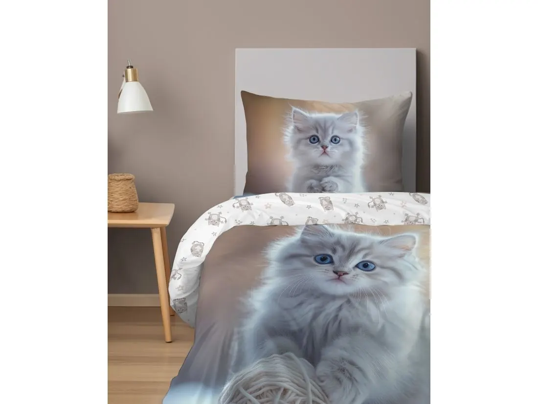 Pościel dziecięca z uroczym kotkiem to doskonałe połączenie funkcjonalności i radosnego wzoru, który z pewnością skradnie serce każdego malucha. Na tkaninie znajduje się przyjazny beżowy kotek bawiący się kłębkiem wełny – motyw, który wprowadza do dziecięcej sypialni atmosferę ciepła i beztroski.