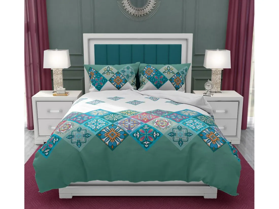 Komplet pościeli z bawełny wzór Diamond w rozmiarze 160 x 200 cm + 2 poszewka 70 x 80 cm to nowoczesny wzór o ciekawej nasyconej kolorystyce. Tkanina gęsto tkana z bawełny 100% przędzy klasycznej o gramaturze 120g/m2. Podczas produkcji poddana procesowi sanforyzacji, merceryzacji, druk na tkaninie pigmentowy.