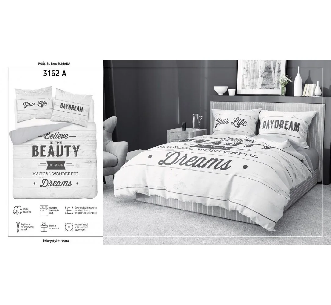 Komplet pościel z bawełny w rozmiarze 160x200 cm z kolekcji Holland firmy Detexpol nr wzoru 3162 a , to nowa odsłona bielizny pościelowej. Fantazyjny wzór w biało szarej kolorystyce sprawi, że każda noc będzie wyjątkowa tylko z radosnymi kolorowymi snami. To propozycja dla każdego miłośnika stylu minimalistycznego, idealna dla każdego kto lubi romantyczne wzory na pościeli.