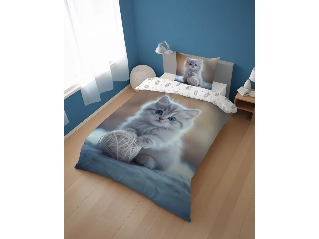 Pościel dziecięca z uroczym kotkiem to doskonałe połączenie funkcjonalności i radosnego wzoru, który z pewnością skradnie serce każdego malucha. Na tkaninie znajduje się przyjazny beżowy kotek bawiący się kłębkiem wełny – motyw, który wprowadza do dziecięcej sypialni atmosferę ciepła i beztroski.