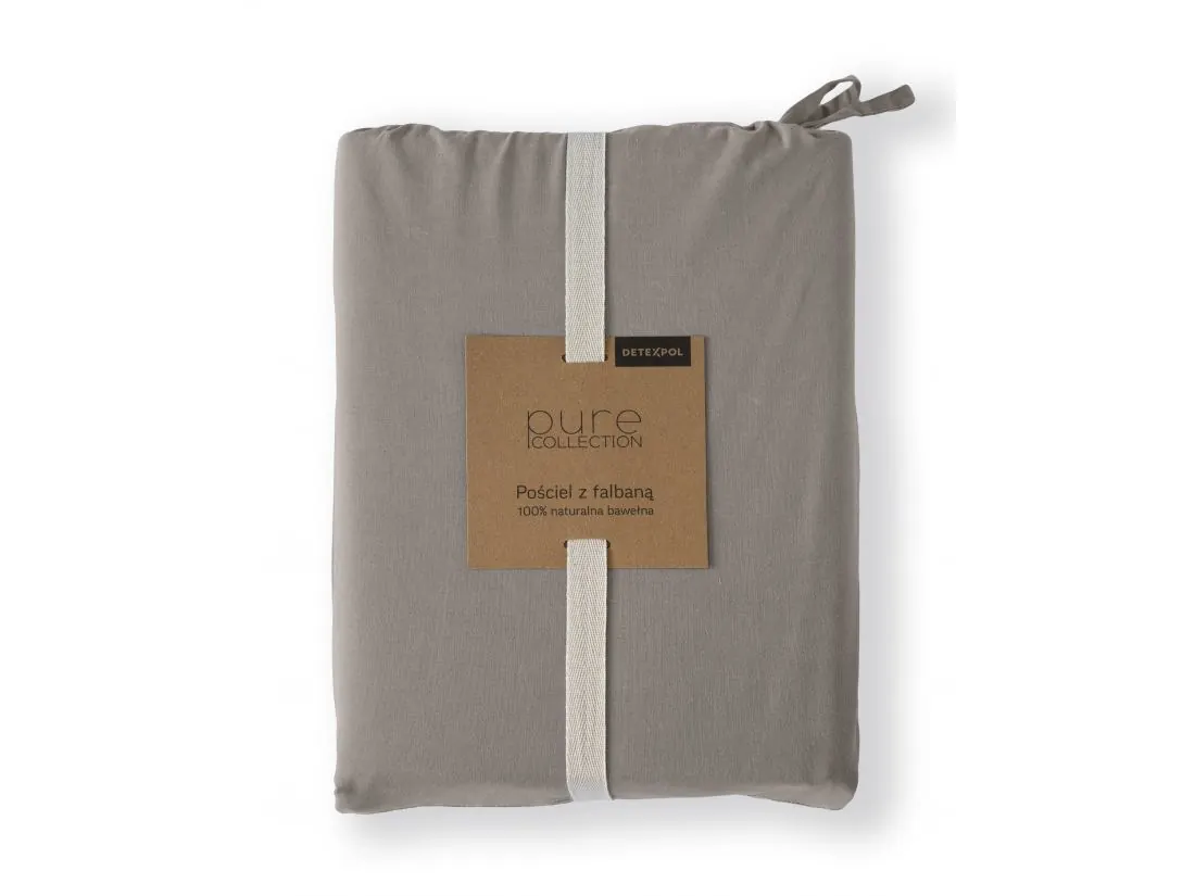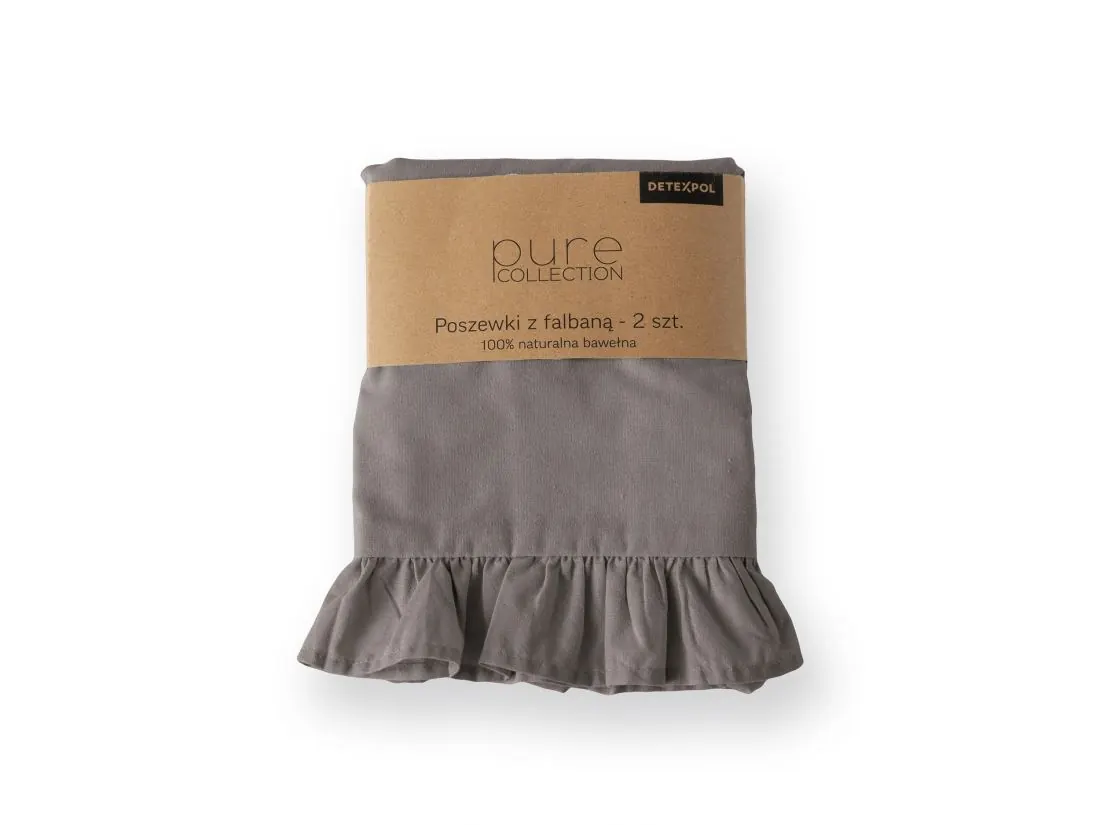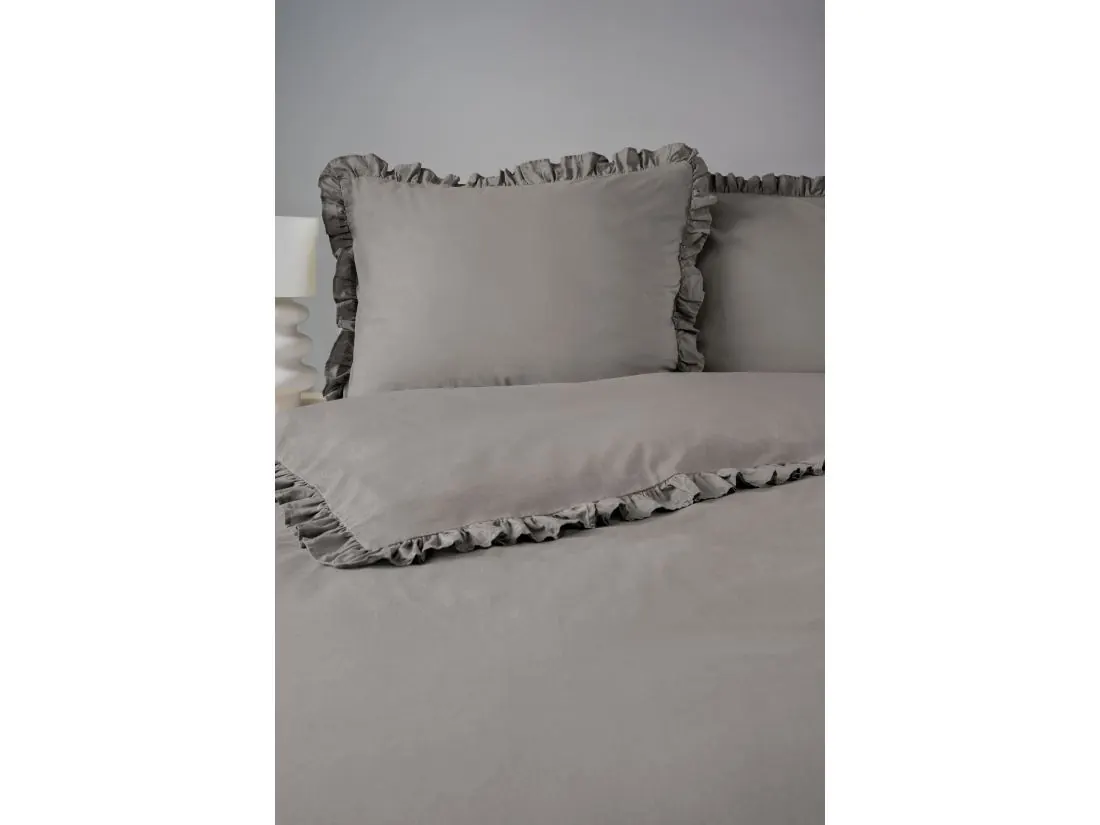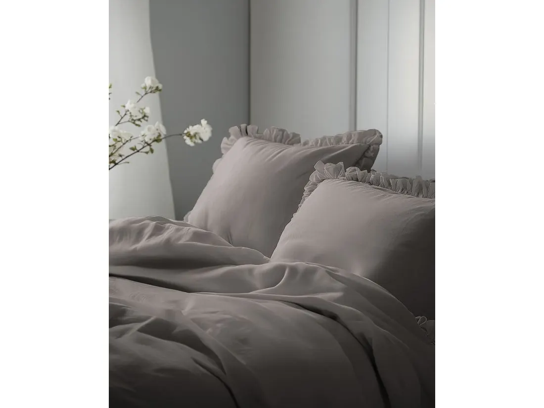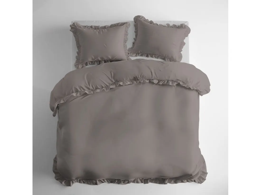 Pościel utrzymana jest w eleganckim, ciepłym odcieniu szarości — uniwersalnym i ponadczasowym, który harmonijnie łączy się zarówno z nowoczesnymi, jak i klasycznymi wnętrzami. Wzór jest gładki, bez nadruków, a dekoracyjne falbanki na brzegach poszwy i poduszki nadają kompletu subtelny, romantyczny charakter i lekką dekoracyjność.