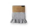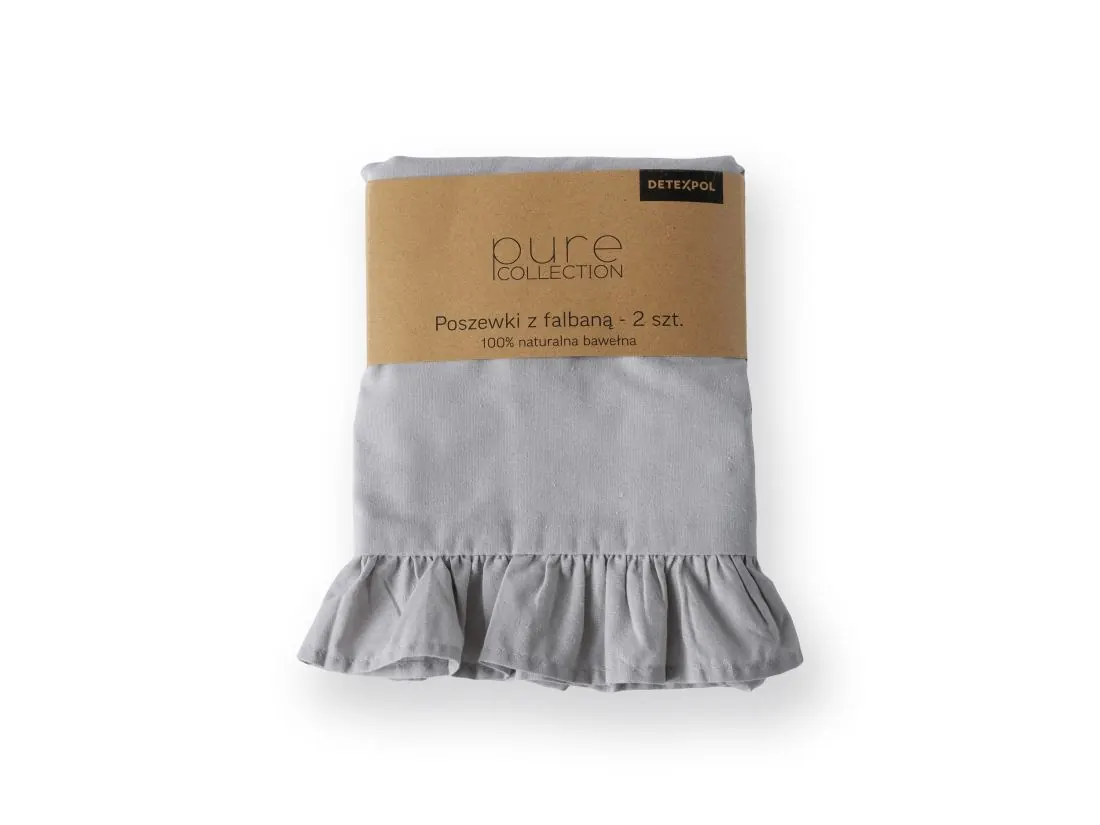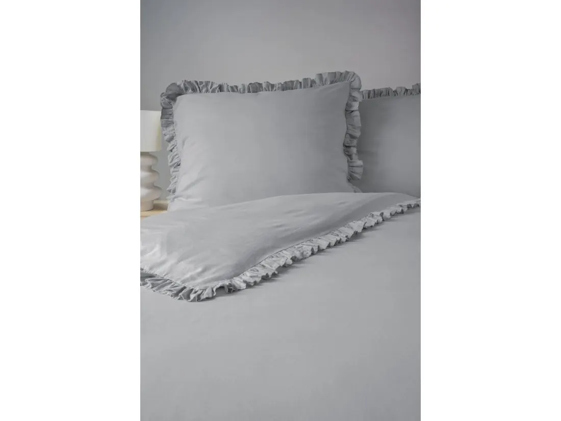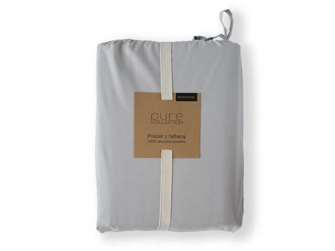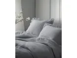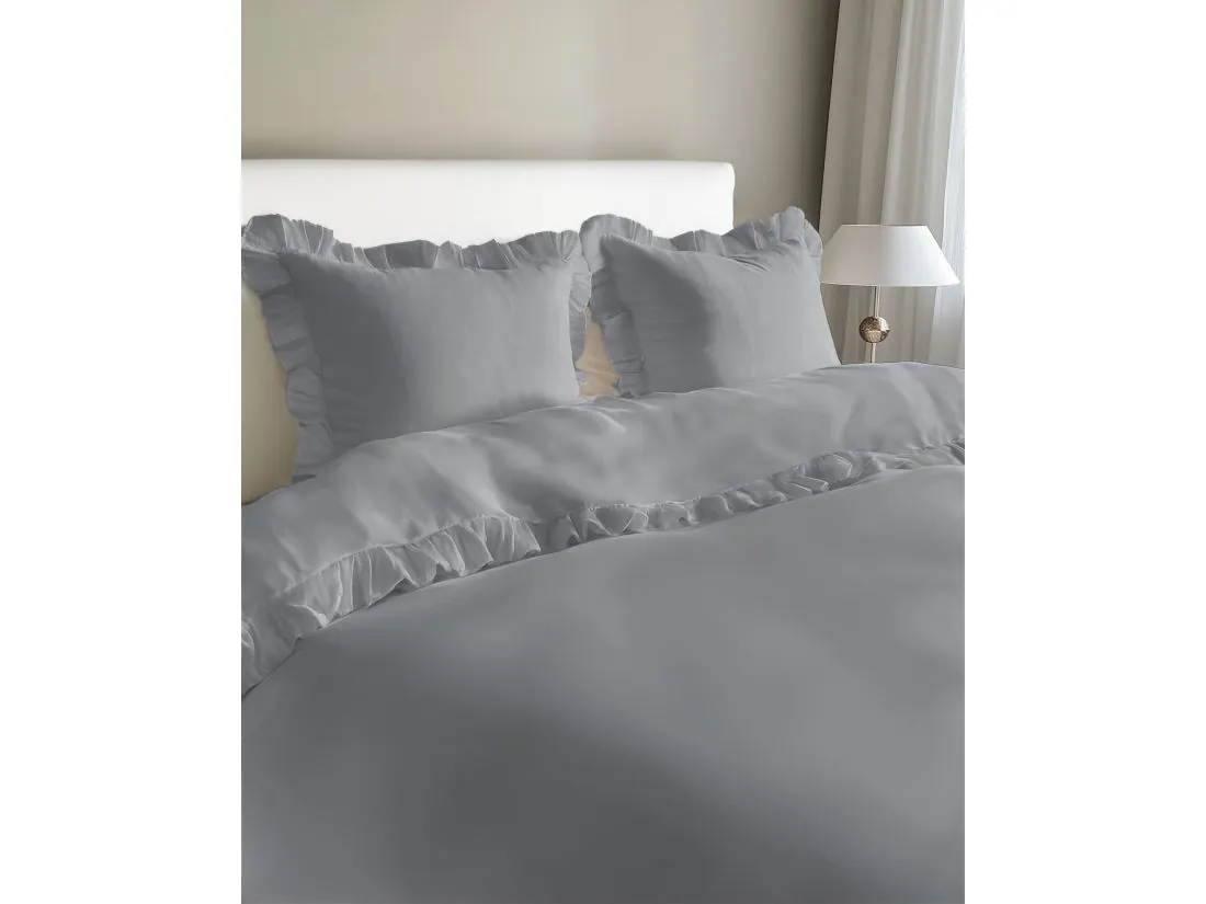 Pościel utrzymana jest w jasnoszarym, neutralnym odcieniu – eleganckim i ponadczasowym. Wzór jest gładki, bez nadruków, a dekoracyjne falbanki na brzegach poszwy i poduszek dodają całości subtelnej elegancji, lekkości i dekoracyjnego charakteru.