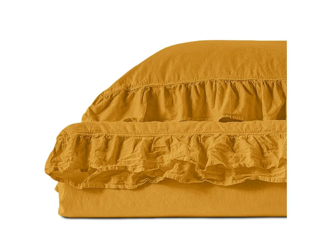 Poszwa na kołdrę została ozdobiona dekoracyjną falbanką, która dodaje elegancji i subtelności. Zapinana na guziki, pościel utrzymuje kołdrę na miejscu, zapewniając wygodę i bezpieczeństwo podczas snu. Poszewka na poduszkę posiada falbankę na czterech stronach, co nadaje jej delikatny i romantyczny wygląd. Poszewka zapinana jest na zakładkę, co sprawia, że wkładka pozostaje na miejscu i nie przesuwa się podczas snu.