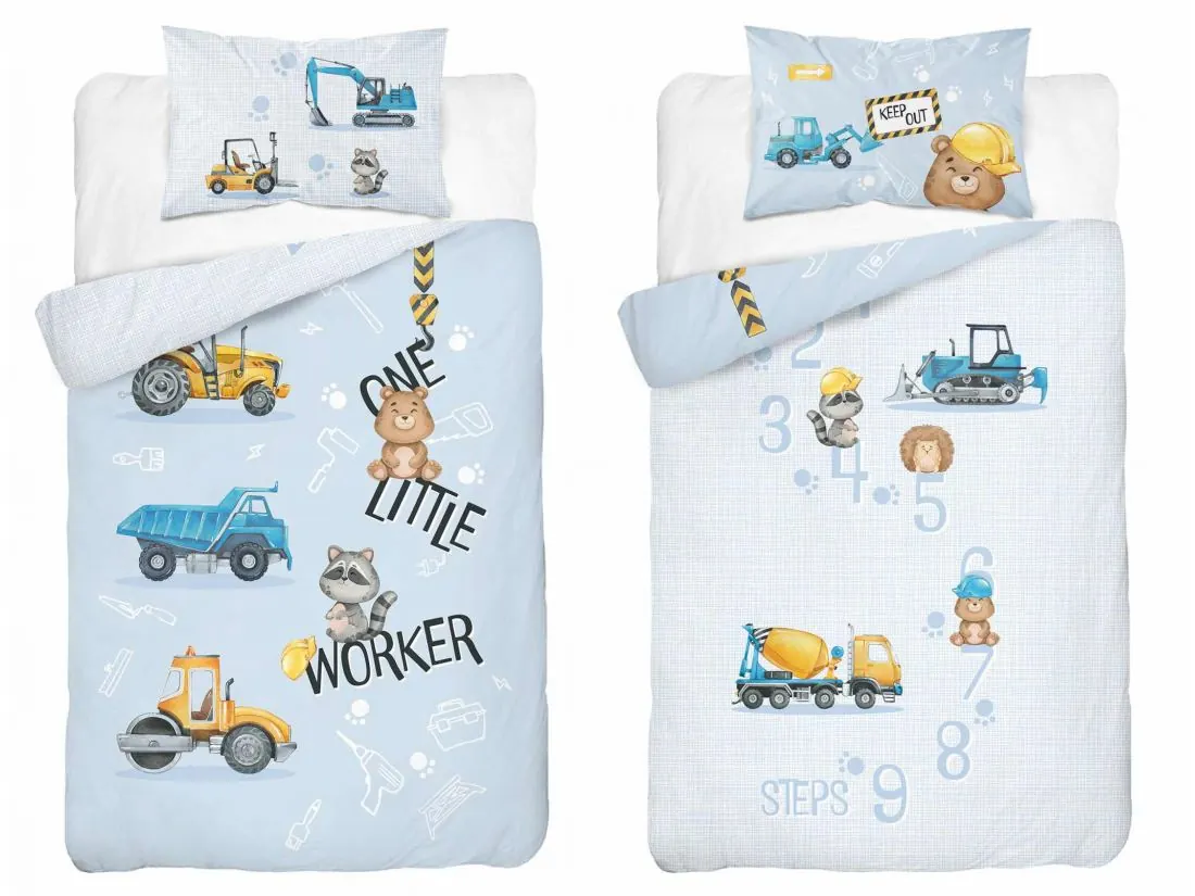 Dwustronny wzór "Pracujące Zwierzątka" przedstawia wesołe zwierzątka zajęte pracą w otoczeniu maszyn budowlanych, takich jak koparki i spychacz, na jasnoniebieskim tle. Kolorowy i przyjazny motyw zachwyci każdego malucha, rozweselając pokój i wprowadzając radosną atmosferę.