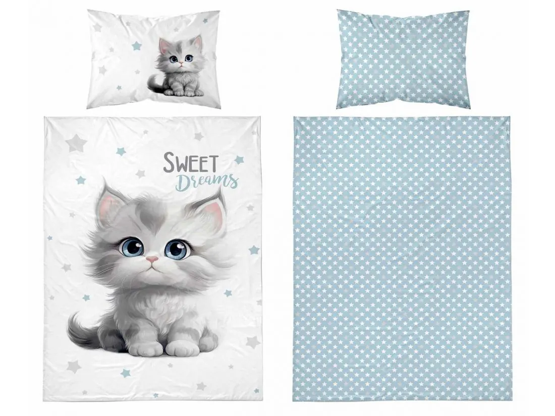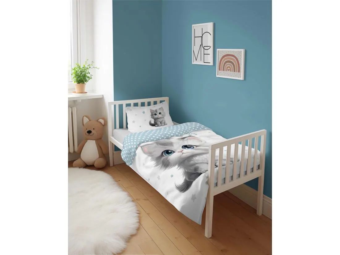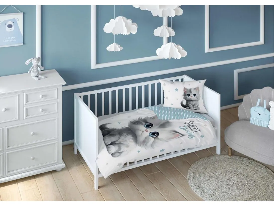 Pościel z bawełny 90x120 + 40x60 szary kotek, turkusowe gwiazdki dla dzieci do łóżeczka 5518 a