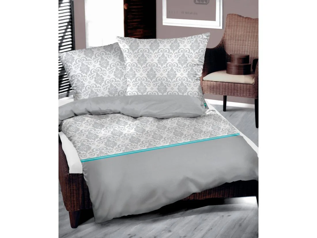 Fantazyjny secesyjny wzór pościeli znakomicie wkomponowany w biało szarą kolorystykę intryguje oraz przyciąga wzrok.