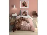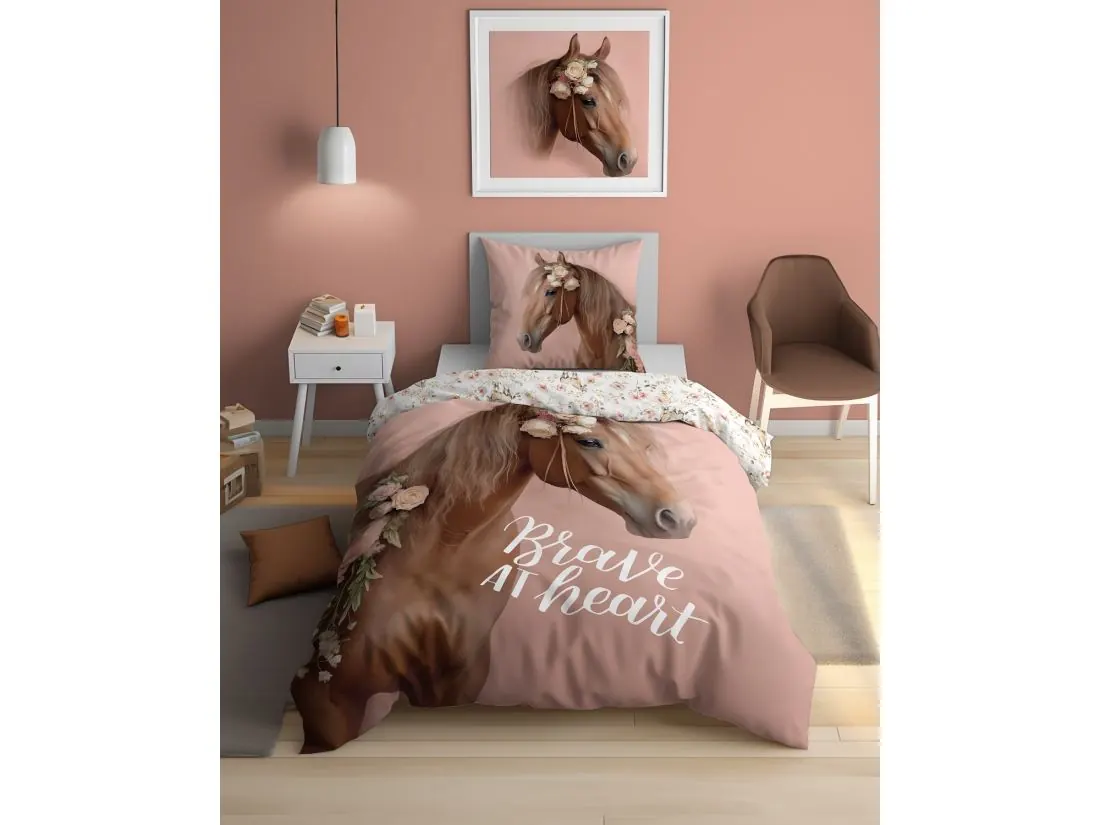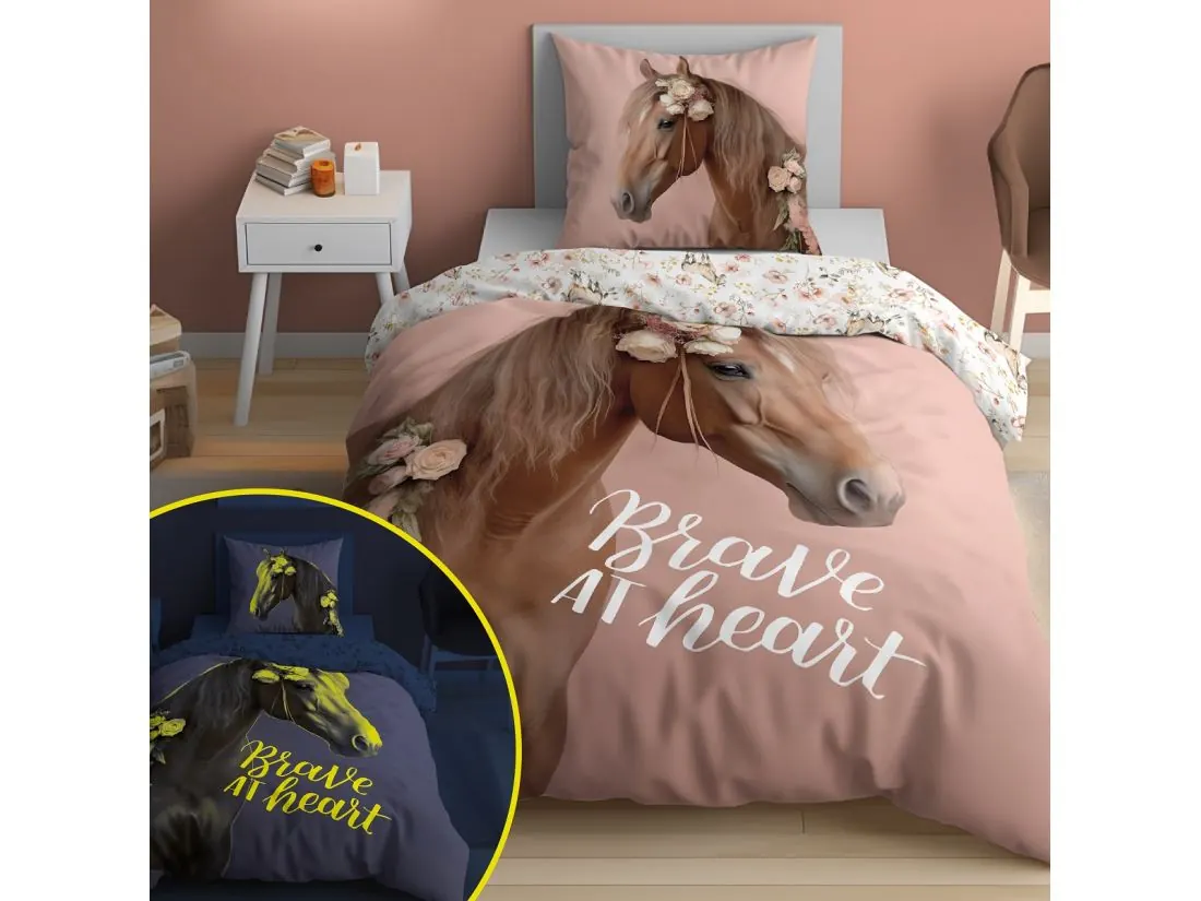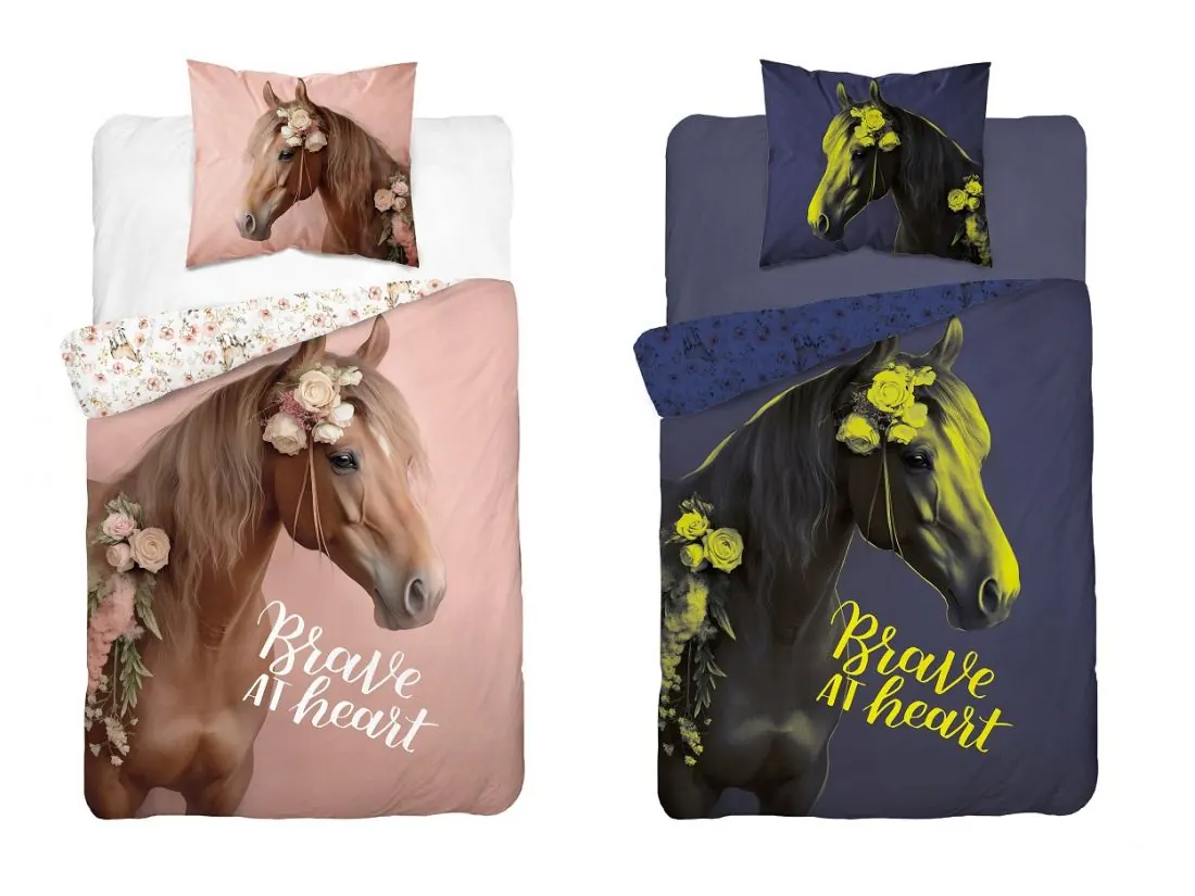 Pościel zachwyca przepięknym, dwustronnym wzorem, który można łatwo dopasować do nastroju lub wystroju pokoju. Jasna strona przedstawia majestatycznego konia otoczonego pastelowymi kwiatami. Ten uroczy motyw wprowadza do wnętrza atmosferę wolności, siły i spokoju, pobudzając wyobraźnię i inspirując do marzeń o beztroskich przygodach w naturze.