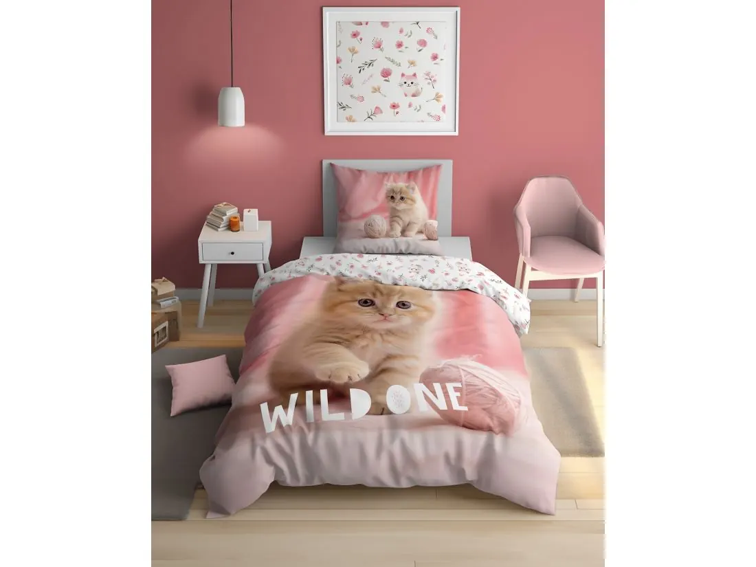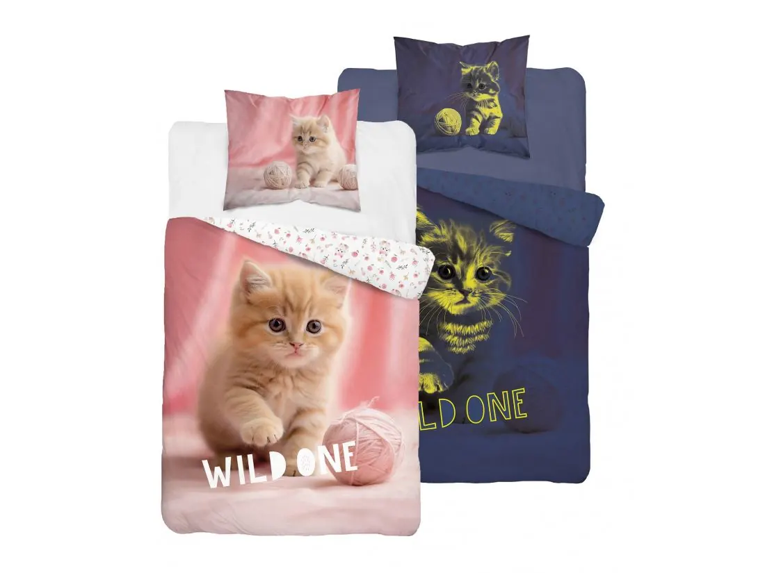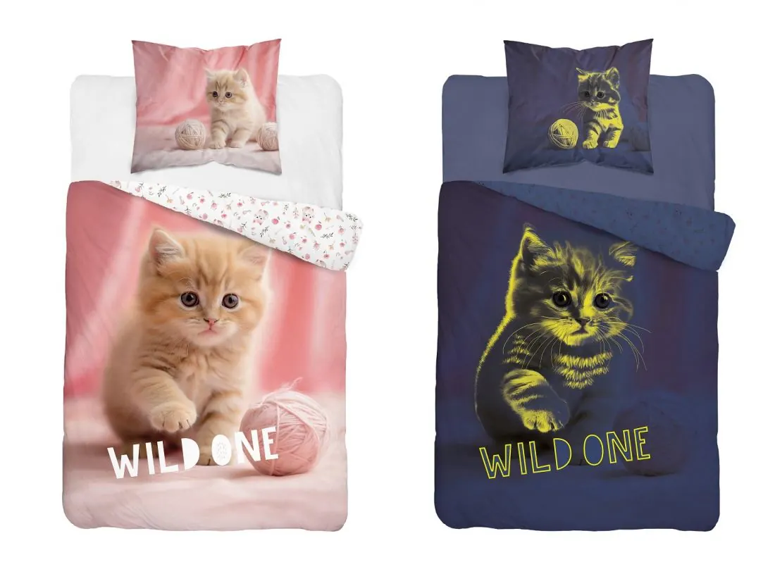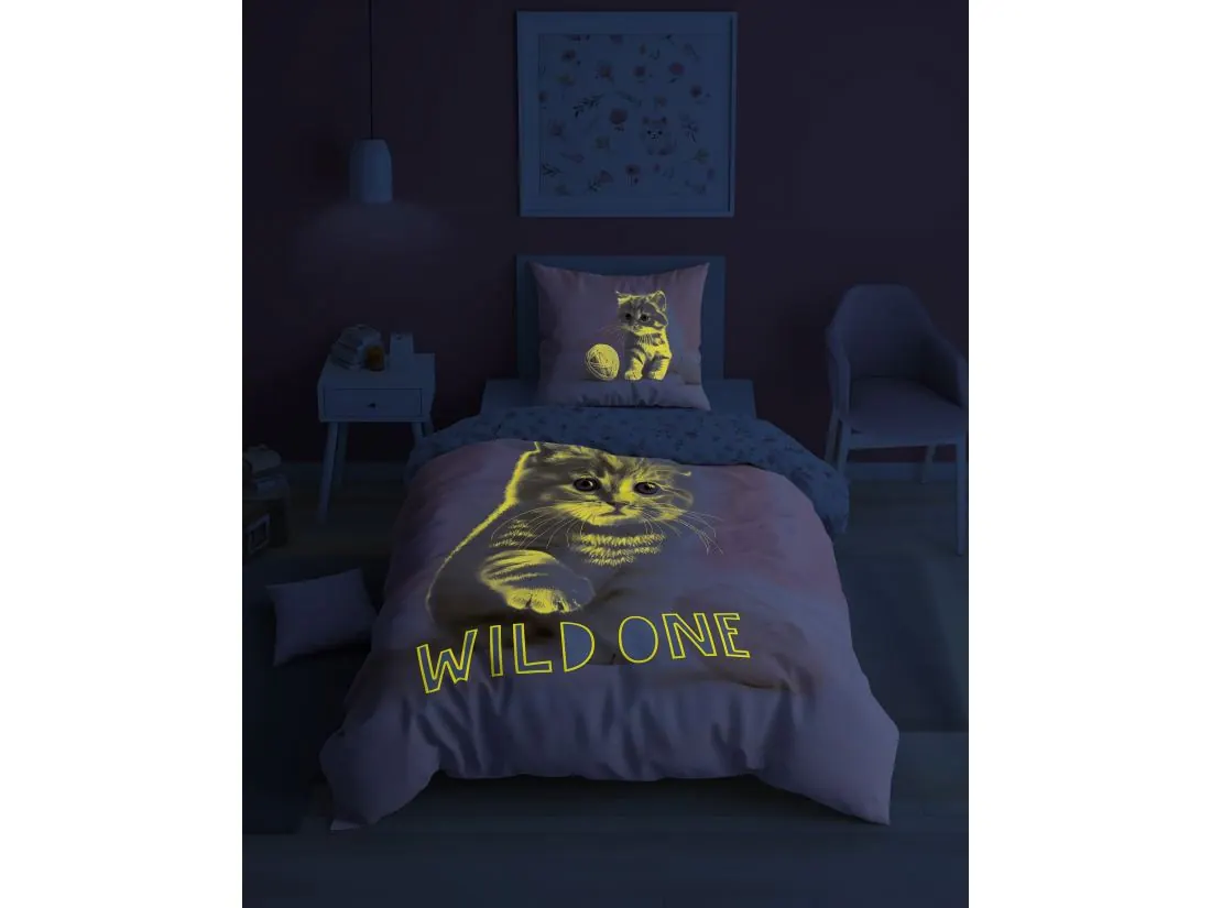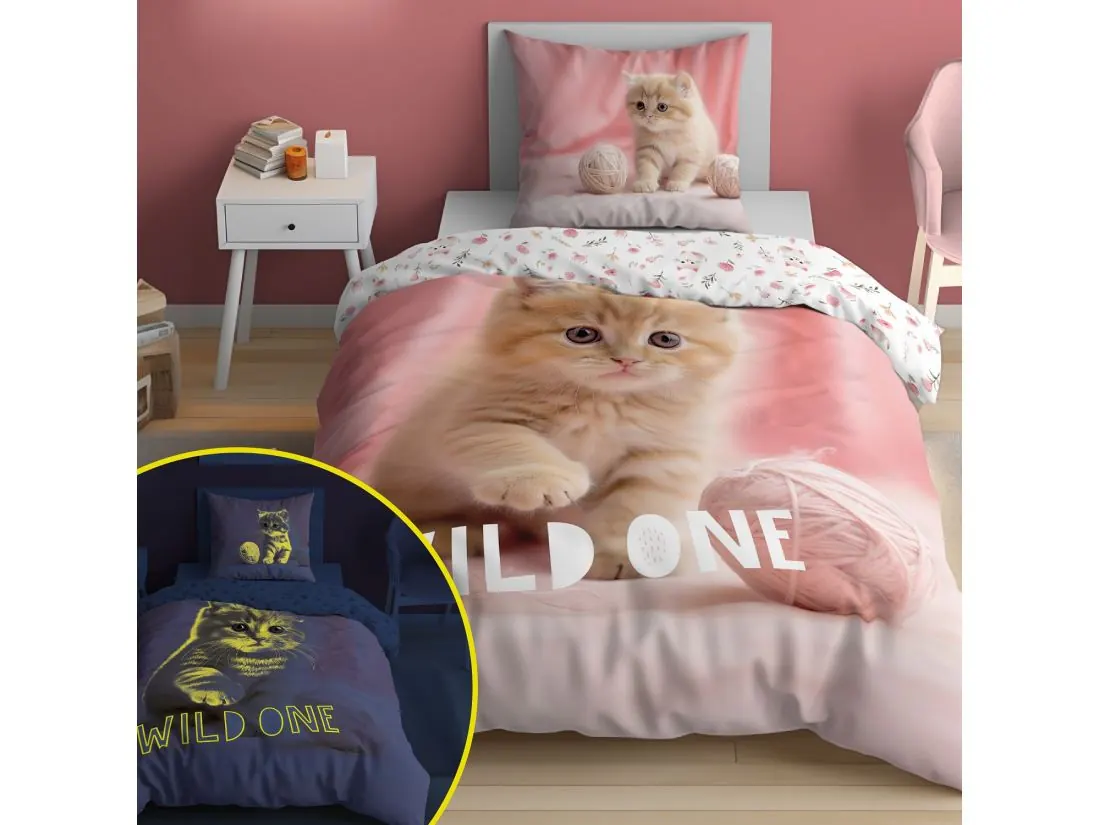 Pościel z bawełny dla dzieci 160x200+70x80 beżowy kotek fluo 5408 a świeci w ciemności