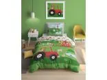 Pościel zachwyca uroczym, dwustronnym wzorem, który można dostosować do nastroju lub wystroju pokoju. Jasna strona przedstawia kolorowe zwierzątka z farmy, takie jak krowa, konik, kurka i owieczka, otoczone polami, drzewami i uśmiechniętym traktorem. Całość tworzy ciepłą, radosną atmosferę, która przenosi dziecko w świat wiejskich przygód i pobudza jego wyobraźnię.