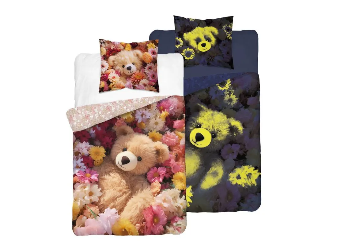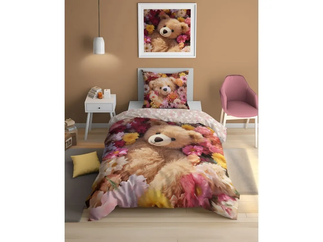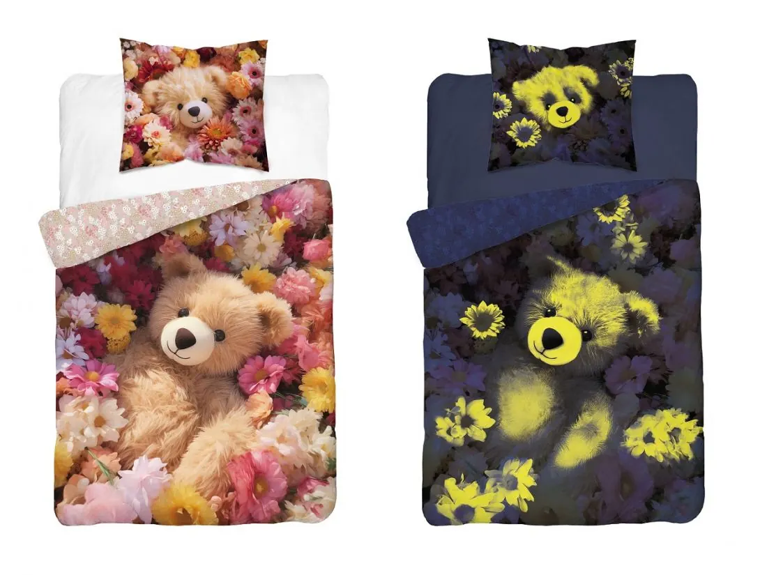 Pościel zachwyca uroczym, dwustronnym wzorem, który można dostosować do nastroju lub wystroju pokoju. Jasna strona przedstawia beżowego misia siedzącego w otoczeniu pastelowych kwiatów, tworząc spokojną i przytulną atmosferę. Ten słodki motyw wnosi do dziecięcego pokoju nutę delikatności i bajkowego uroku, inspirując do radosnych, pełnych ciepła snów.