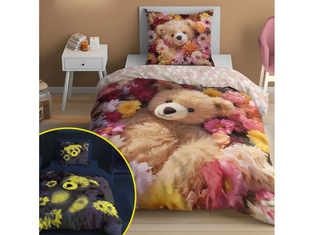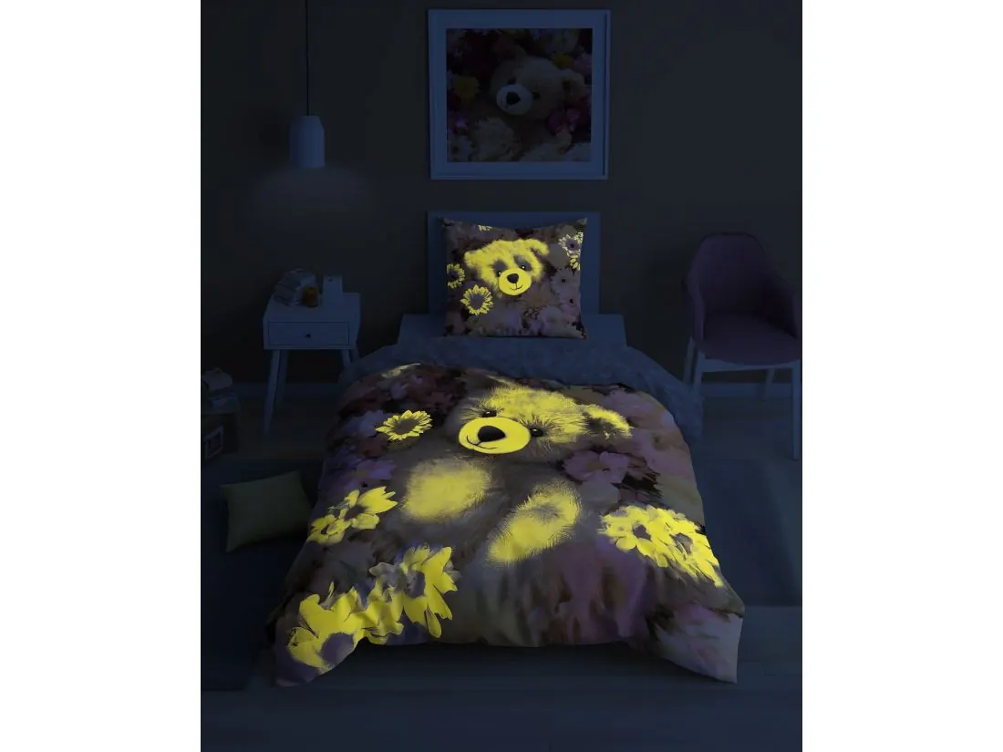 Pościel z bawełny dla dzieci 160x200+70x80 miś fluo 5415 a świeci w ciemności