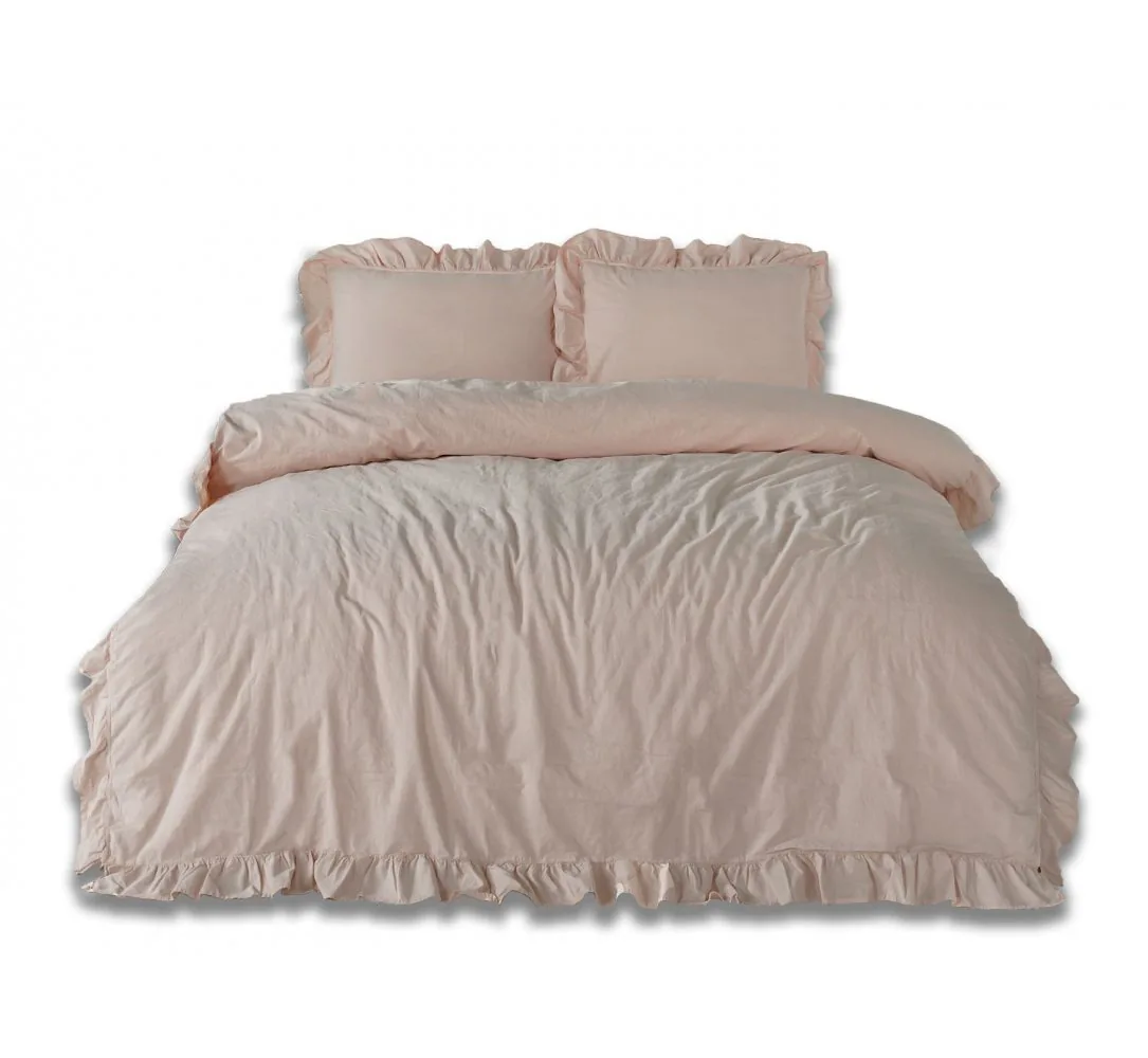 Poszwa na kołdrę została ozdobiona dekoracyjną falbanką, która dodaje elegancji i subtelności. Zapinana na guziki, pościel utrzymuje kołdrę na miejscu, zapewniając wygodę i bezpieczeństwo podczas snu. Poszewka na poduszkę posiada falbankę na czterech stronach, co nadaje jej delikatny i romantyczny wygląd. Poszewka zapinana jest na zakładkę, co sprawia, że wkładka pozostaje na miejscu i nie przesuwa się podczas snu.