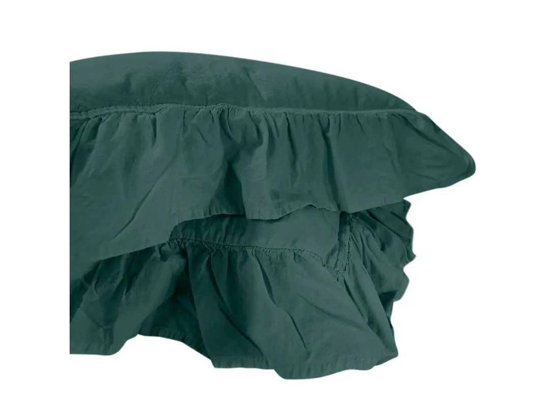 Poszwa na kołdrę została ozdobiona dekoracyjną falbanką, która dodaje elegancji i subtelności. Zapinana na guziki, pościel utrzymuje kołdrę na miejscu, zapewniając wygodę i bezpieczeństwo podczas snu. Poszewka na poduszkę posiada falbankę na czterech stronach, co nadaje jej delikatny i romantyczny wygląd. Poszewka zapinana jest na zakładkę, co sprawia, że wkładka pozostaje na miejscu i nie przesuwa się podczas snu.
