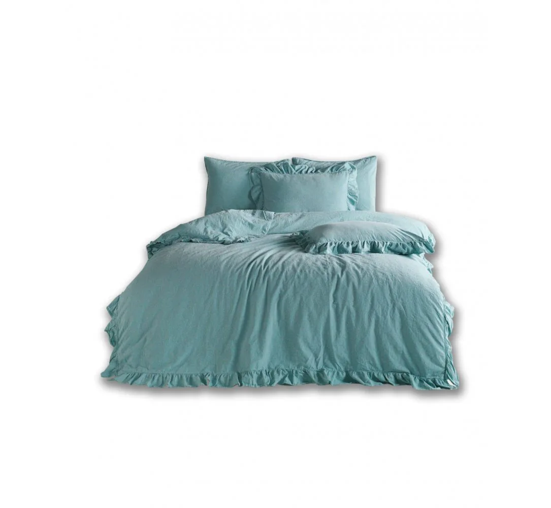 Poszwa na kołdrę została ozdobiona dekoracyjną falbanką, która dodaje elegancji i subtelności. Zapinana na guziki, pościel utrzymuje kołdrę na miejscu, zapewniając wygodę i bezpieczeństwo podczas snu. Poszewka na poduszkę posiada falbankę na czterech stronach, co nadaje jej delikatny i romantyczny wygląd. Poszewka zapinana jest na zakładkę, co sprawia, że wkładka pozostaje na miejscu i nie przesuwa się podczas snu.