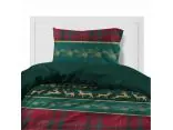 Na ciemnozielonym tle, które przywodzi na myśl zimowy las, rozproszone zostały delikatne śnieżynki, a głównym elementem dekoracyjnym są stylizowane złote renifery – symbol świąt i zimowej magii. Całość dopełniają subtelne stroiki bożonarodzeniowe – gałązki ostrokrzewu, jemioła i szyszki – które dodają naturalnego uroku i tworzą spójną, elegancką kompozycję. Złote akcenty nadruku pięknie kontrastują z głęboką zielenią, wprowadzając do wnętrza nutę luksusu.