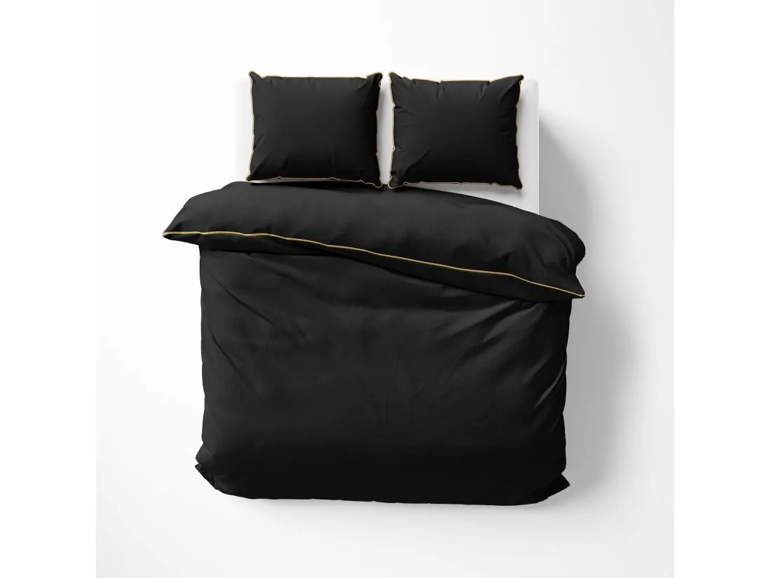 Poszwa na kołdrę oraz poszewki zostały wykończone złotą ozdobną lamówką, która tworzy efektowny kontrast z czarnym tłem i podkreśla staranne wykonanie kompletu.