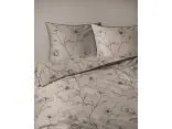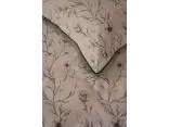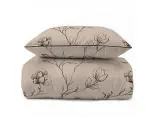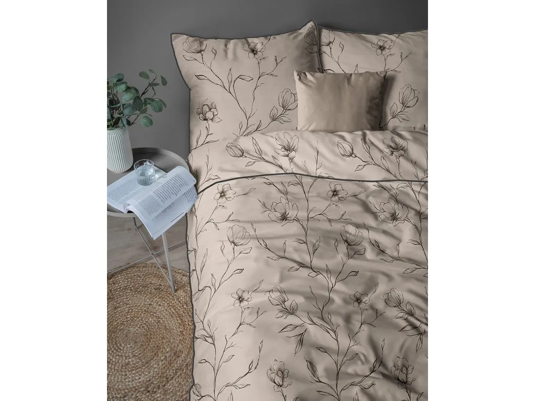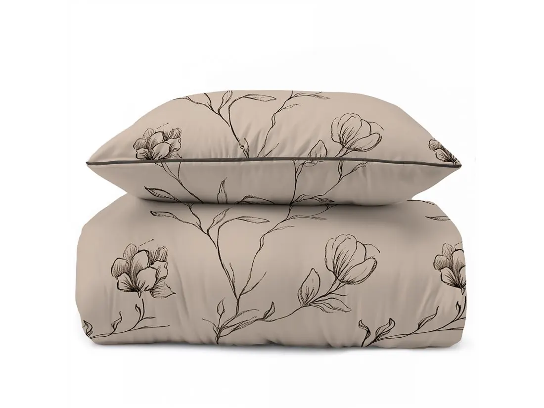 Model ten to wyrafinowane połączenie ciepłej kolorystyki z nowoczesną formą graficzną. Na spokojnym, beżowym tle umieszczono subtelne, czarne kontury kwiatów magnolii, wykonane w modnej technice line art. Wyjątkowość tej pościeli perkalowej podkreśla kontrastująca, ciemnobrązowa lamówka, która precyzyjnie obiega krawędzie poszwy i poszewek, nadając całemu zestawowi luksusowy i wyrazisty wygląd. Projekt dopełnia zamek błyskawiczny ukryty pod specjalną plisą, co zapewnia pełen komfort użytkowania i nienaganną estetykę.