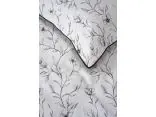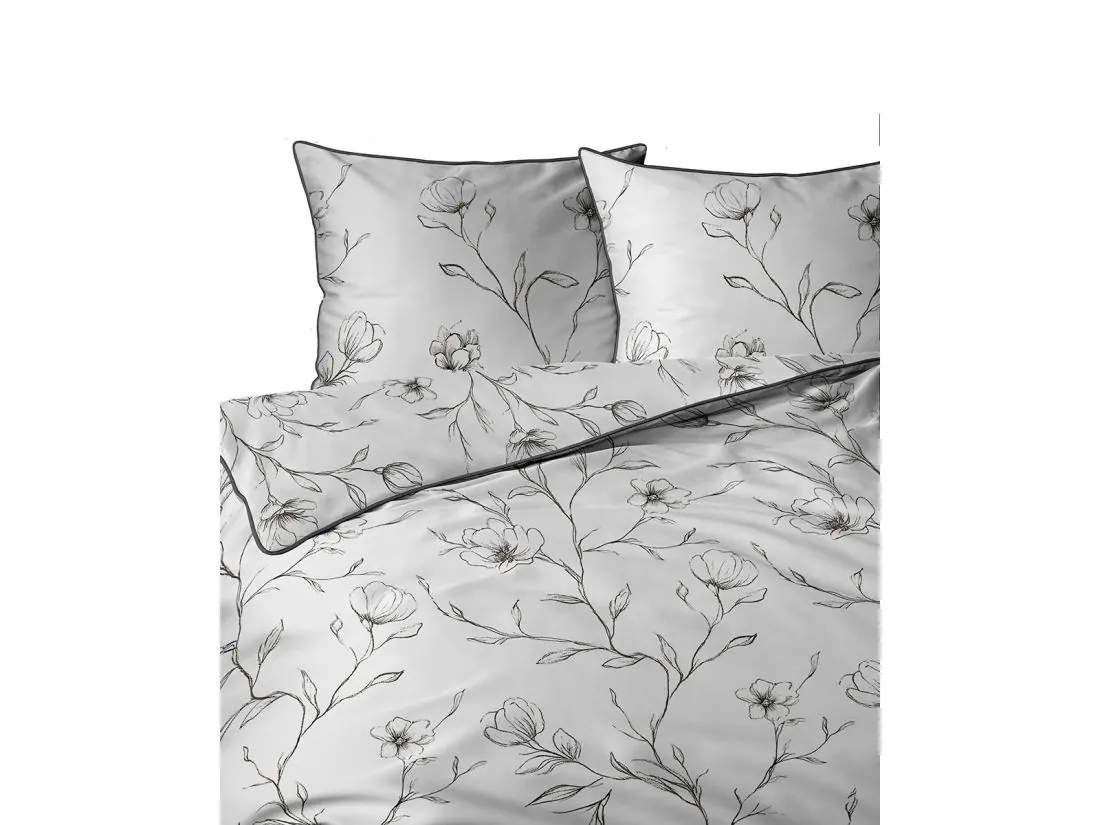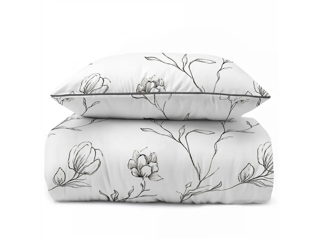 Model ten to połączenie nowoczesnego minimalizmu z klasycznym motywem roślinnym. Na czystym, białym tle zaprezentowano subtelne, czarne kontury rozłożystych kwiatów magnolii, wykonane w modnej stylistyce line art. Wyjątkowość tej pościeli perkalowej podkreśla kontrastująca, czarna lamówka, która precyzyjnie obramowuje krawędzie poszwy i poszewek, nadając całemu zestawowi luksusowy i graficzny wygląd. Projekt dopełnia zamek błyskawiczny ukryty pod specjalną plisą, co zapewnia pełen komfort użytkowania i nienaganną estetykę.