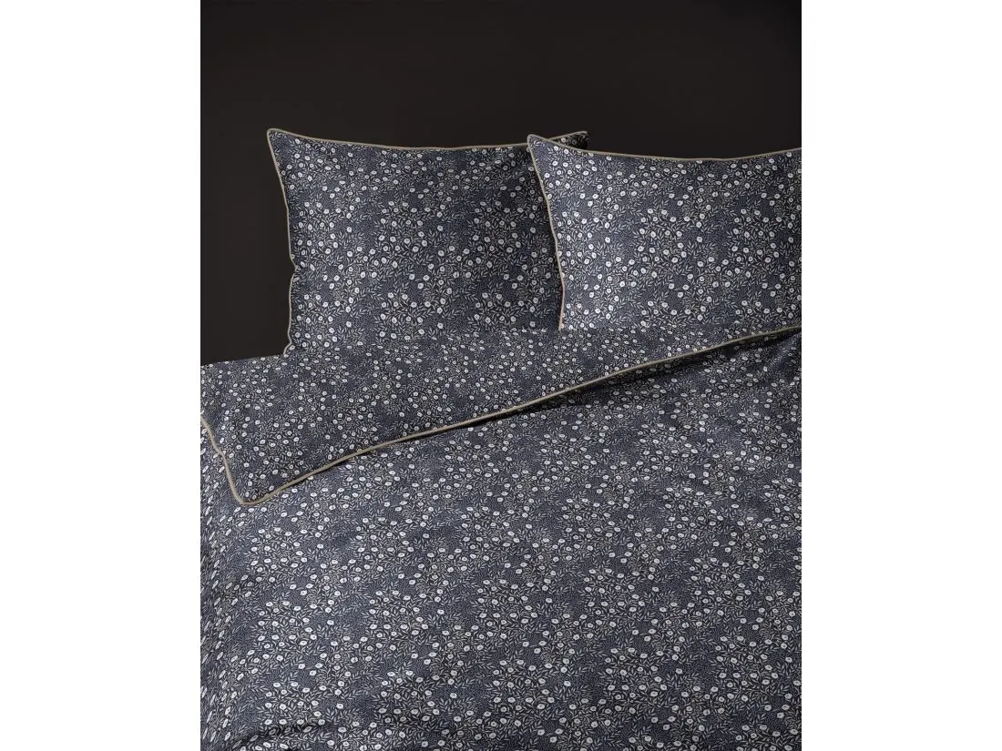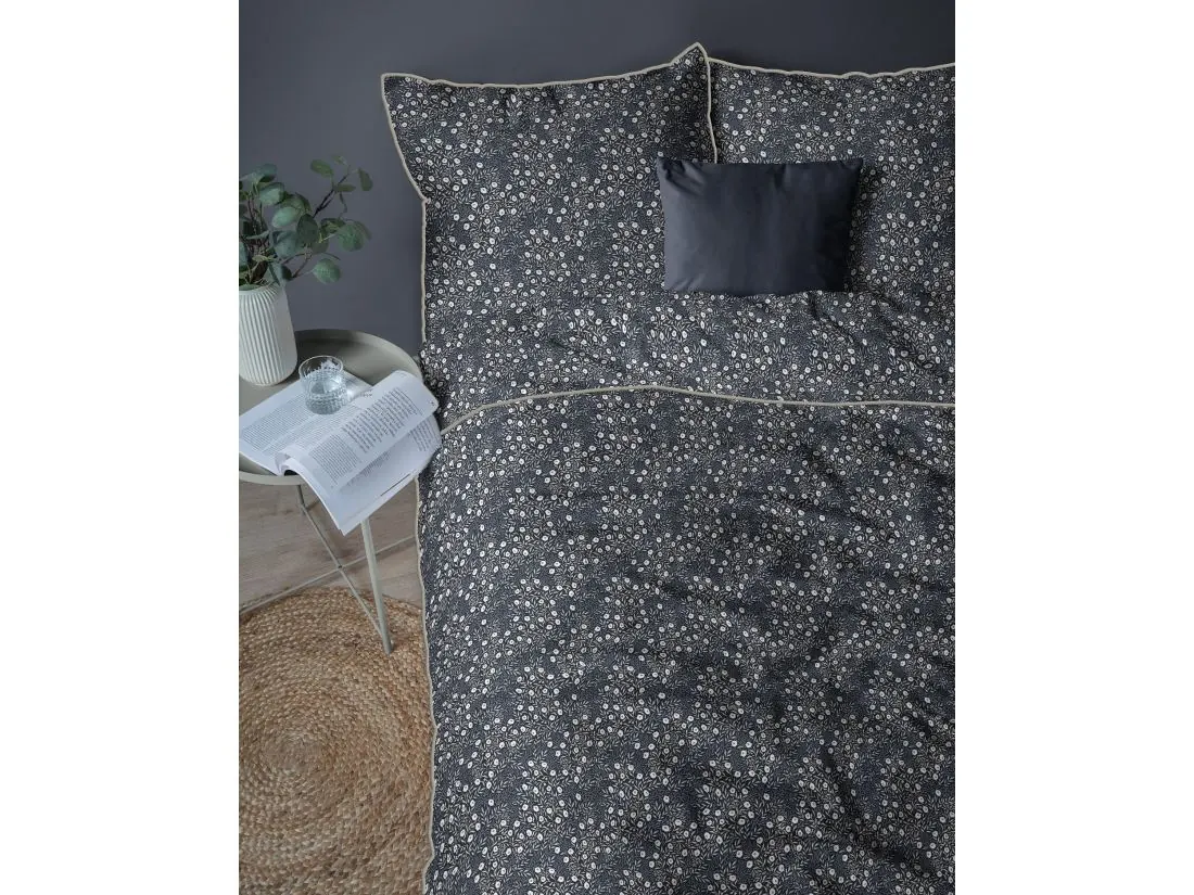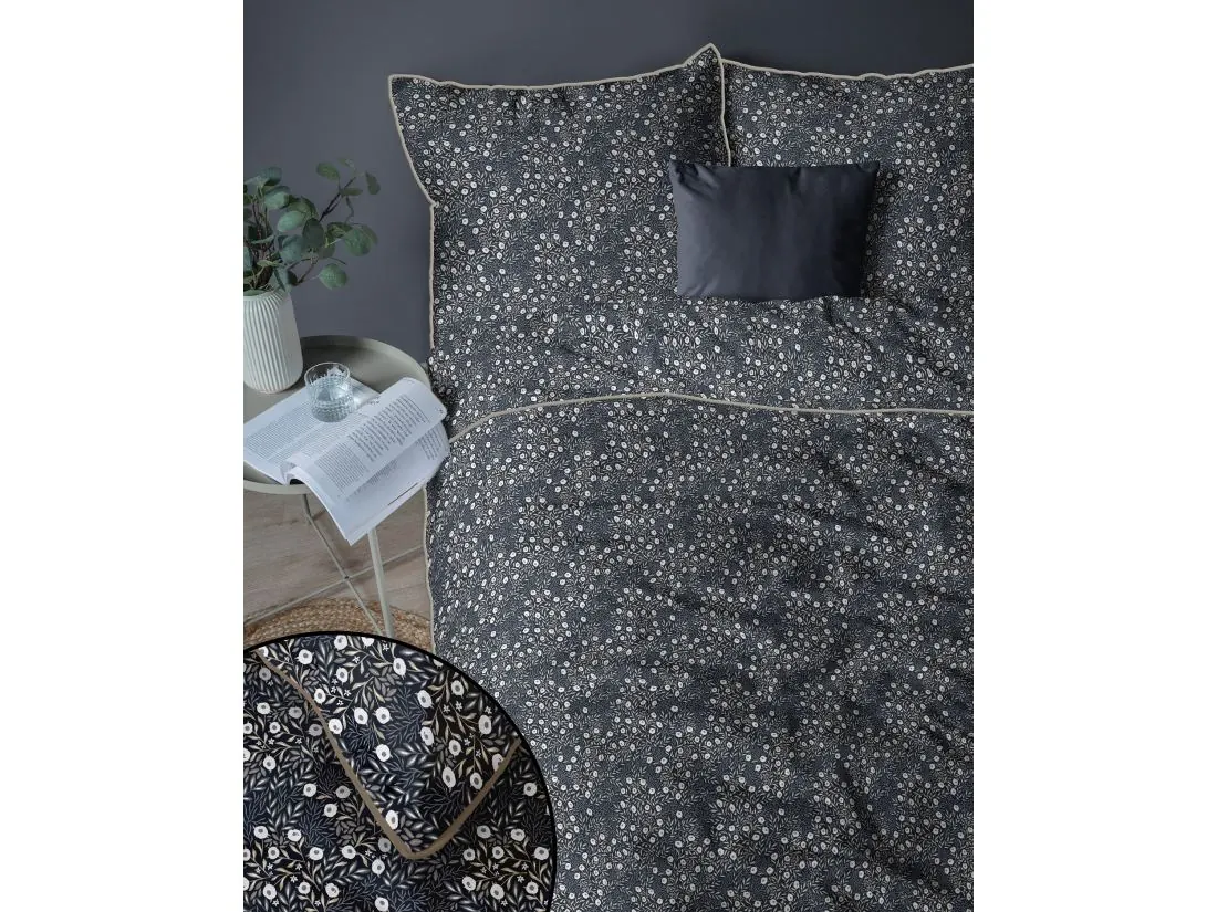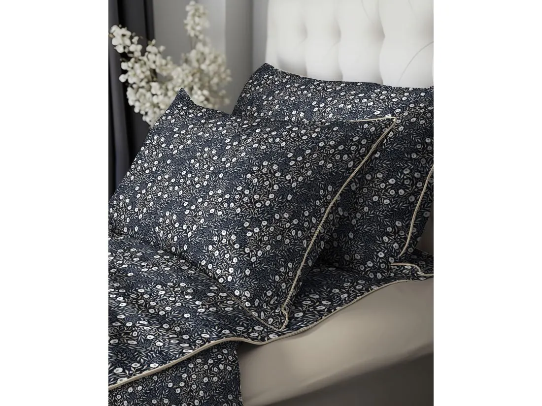 Wyjątkowego charakteru pościeli Lame Percale nadaje precyzyjnie wszyta płaska lamówka, idealnie dopasowana do tła lub wzoru pościeli. Lamówka nie tylko podkreśla estetykę, ale również stabilizuje materiał podczas użytkowania, zapewniając trwałość i nienaganny wygląd. Poszewki na poduszki z tej linii posiadają dodatkowe, subtelne odpasowanie, które nadaje całości uroku, elegancji i światowego stylu.
