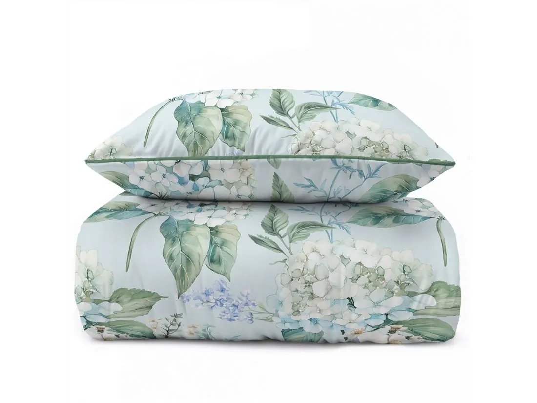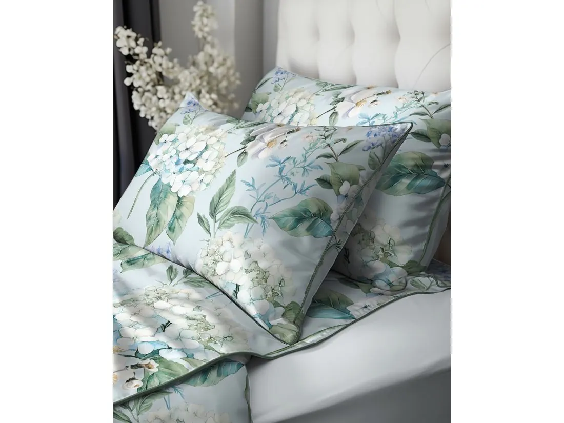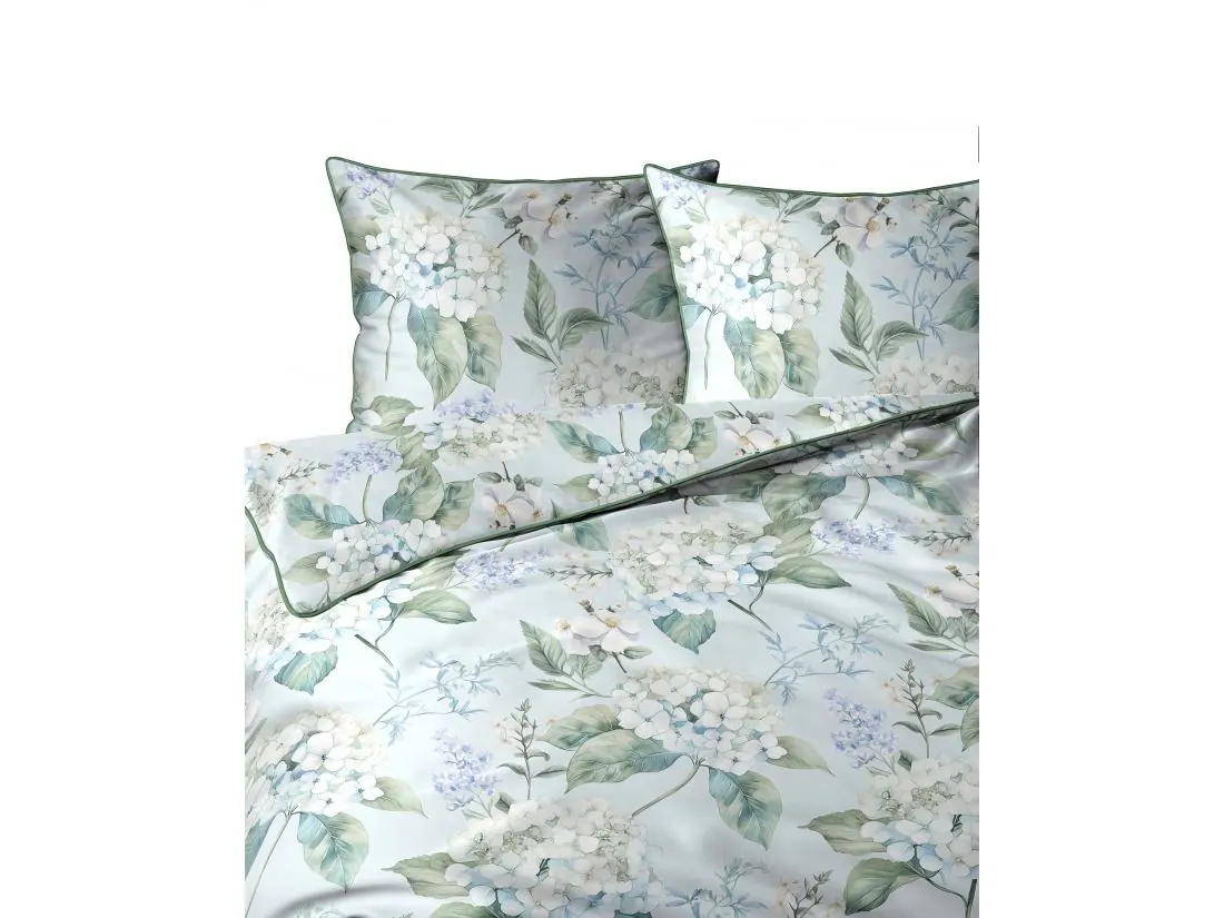 Pościel z perkalu 160x200 + 2/70x80 z lamówką + torba, kwiaty na miętowe tle Lame Percale 5589 a