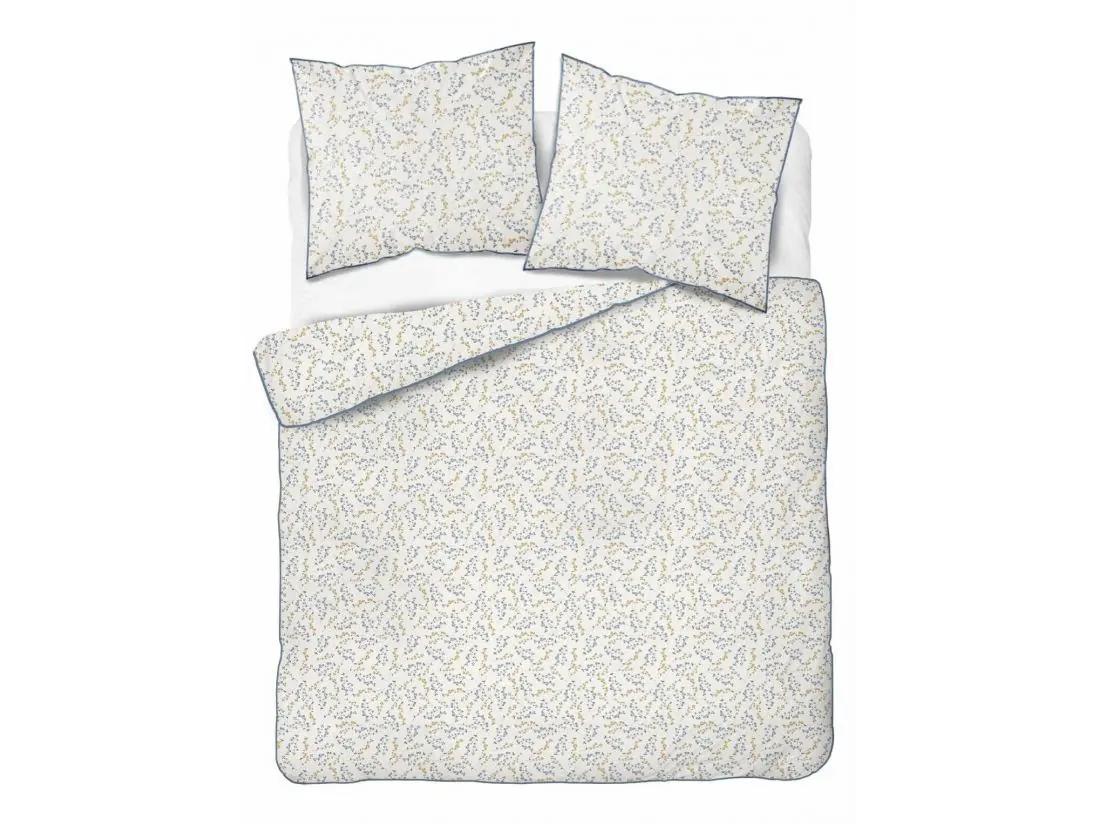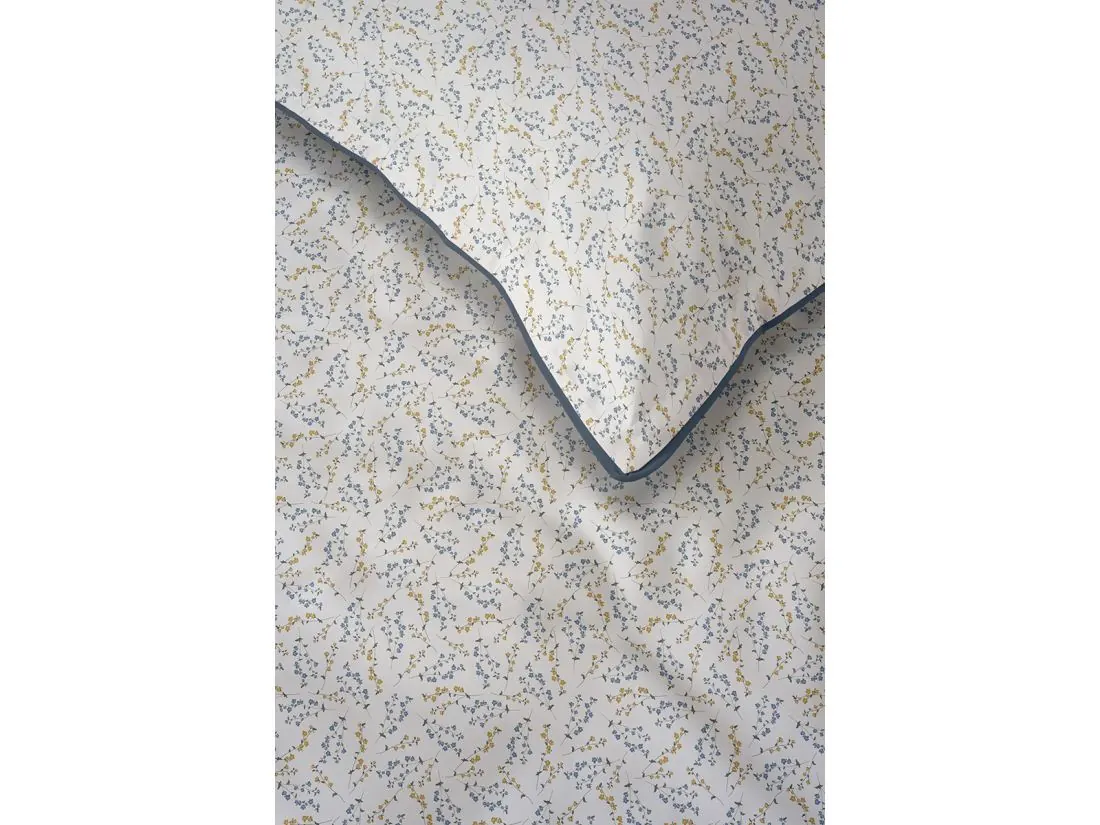 Ta wyjątkowa pościel perkalowa z kolekcji Lame Percale urzeka niezwykle delikatnym, drobnym motywem floralnym, przypominającym polną łąkę o poranku. Kompozycja drobnych kwiatuszków w odcieniach stonowanego błękitu i miodowego złota na czystym, białym tle, emanuje lekkością i świeżością. To propozycja stworzona dla osób pragnących wprowadzić do sypialni harmonijny, kojący klimat sprzyjający głębokiej regeneracji na dużej powierzchni wypoczynkowej o wymiarach 220x200. Unikalnego charakteru nadaje tej pościeli z perkalu kontrastująca, ciemnoniebieska lamówka, która precyzyjnie obramowuje krawędzie. Dla pełnej estetyki i komfortu, zamek błyskawiczny został ukryty pod specjalną plisą, co sprawia, że jest on całkowicie niewidoczny i niewyczuwalny podczas snu.