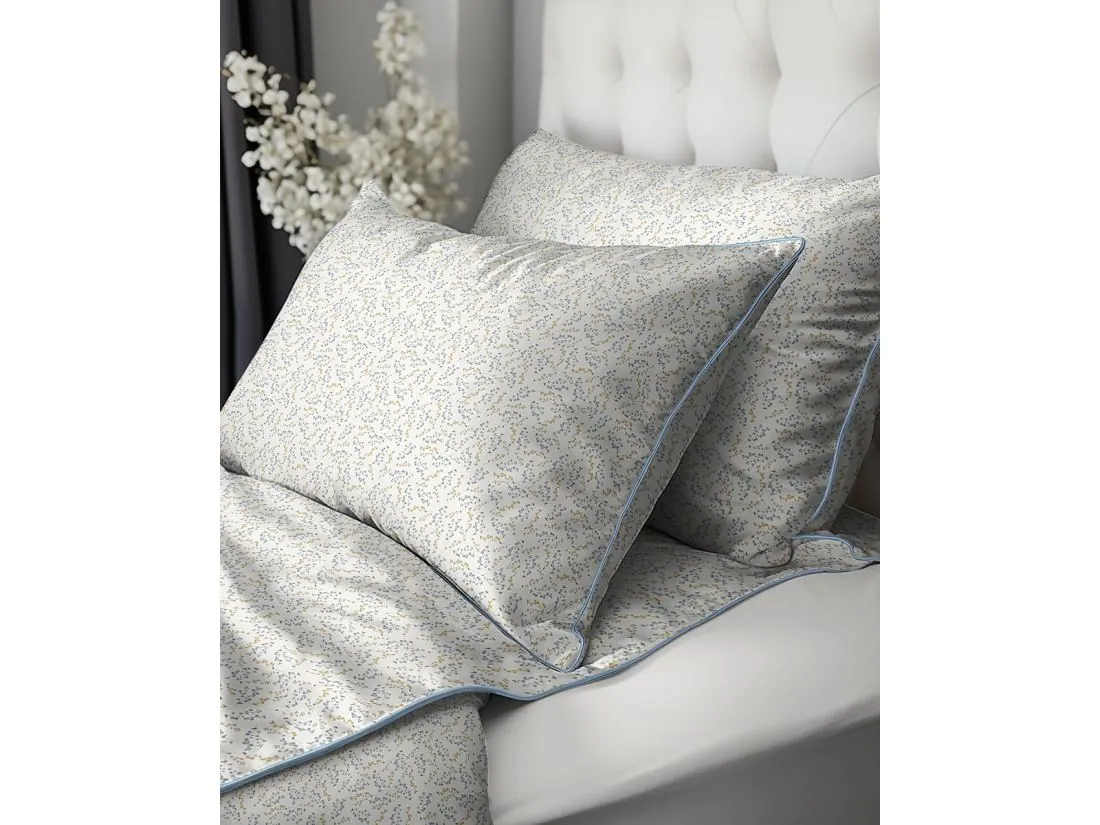 Ten wzór idealnie wpisuje się w minimalistyczne oraz skandynawskie aranżacje sypialni, gdzie drobne detale i jasne barwy budują przestrzeń. Perkal w tym wydaniu doskonale podkreśla styl modern classic, łącząc tradycyjny motyw roślinny z nowoczesnym wykończeniem w postaci lamówki. W sypialniach typu hamptons wzór ten wnosi powiew morskiej świeżości, idealnie komponując się z białą stolarką i niebieskimi dodatkami.