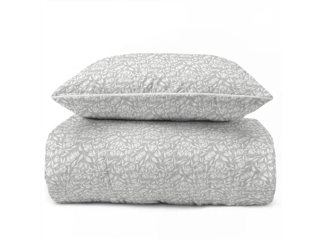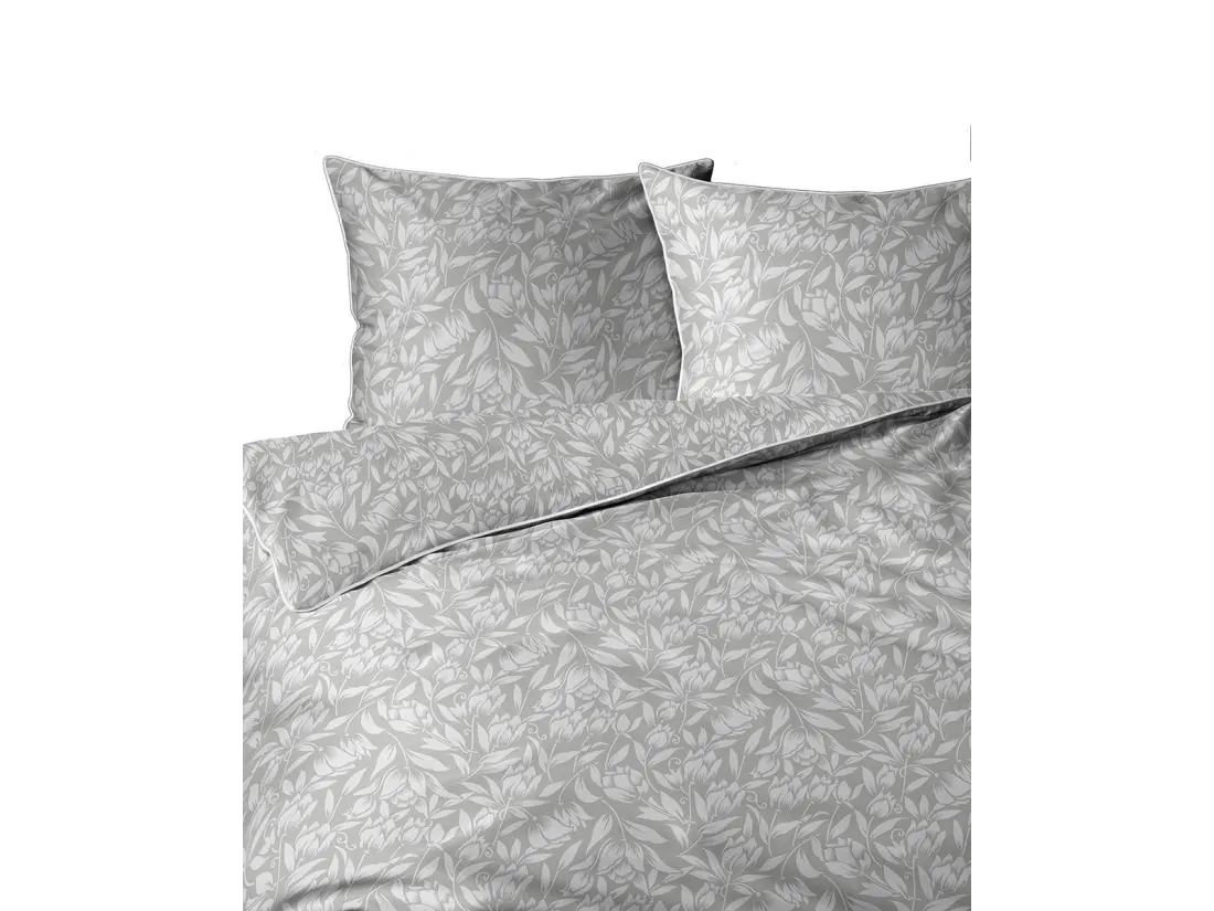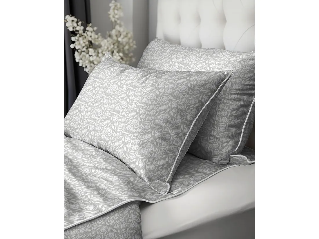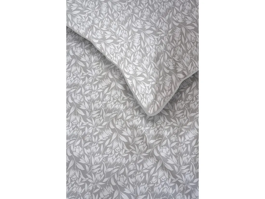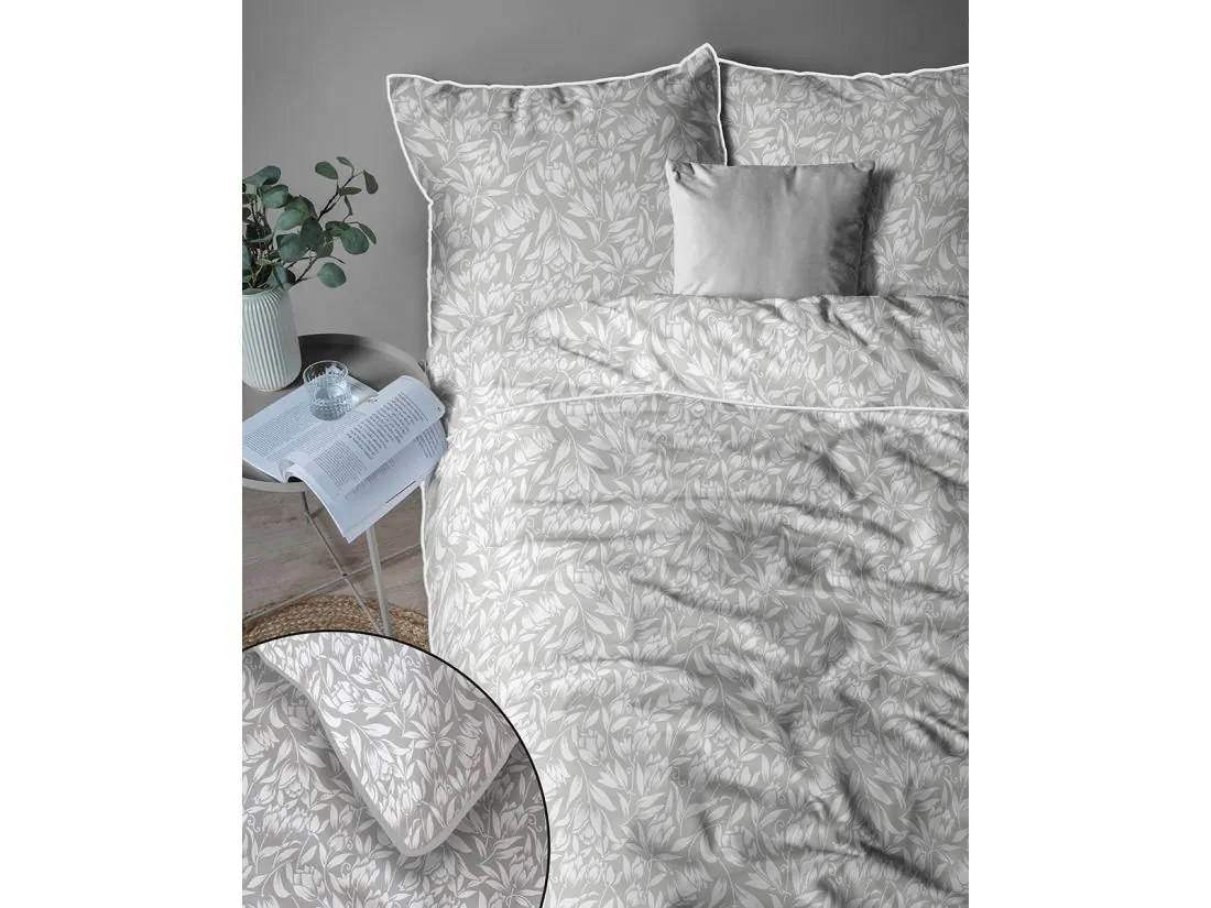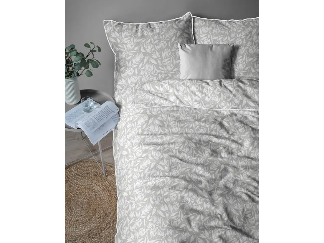 Model ten to połączenie nowoczesnej kolorystyki z subtelnym motywem roślinnym. Na eleganckim, szarym tle zaprezentowano gęsty wzór białych liści i pąków kwiatów, tworzący harmonijną i spokojną kompozycję na całej powierzchni 220x200. Wyjątkowość tej pościeli perkalowej podkreśla kontrastująca, biała lamówka, która precyzyjnie obramowuje krawędzie poszwy i poszewek, nadając całemu zestawowi luksusowy i uporządkowany wygląd. Projekt dopełnia zamek błyskawiczny ukryty pod specjalną plisą, co zapewnia pełen komfort użytkowania i nienaganną estetykę.