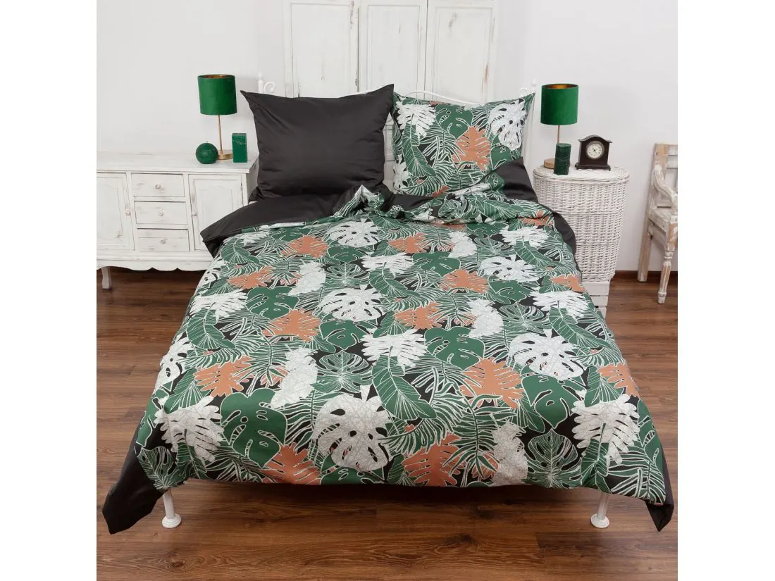 Pościel dwustronna z jednej strony kwiatowy wzór liści monstery z drugiej strony magiczny grafitowy kolor, to wyjście z monotonii oraz obiekt pożądania wszystkich ceniących luksus i elegancja w swojej sypialni.
