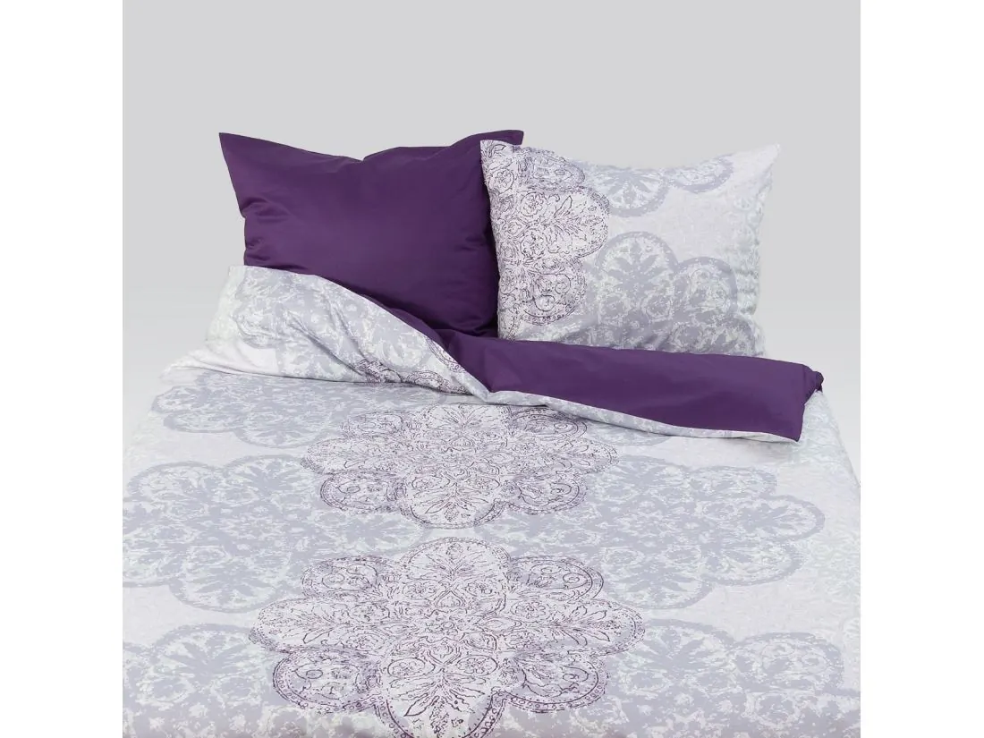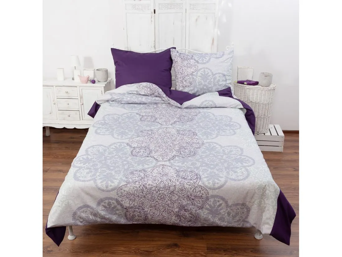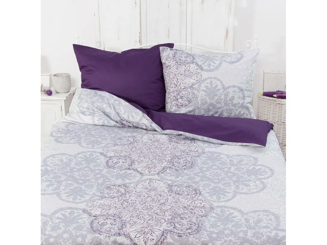 Pościel dwustronna z jednej strony fantazyjny wzór rozety-origami z drugiej strony uroczy fiolet, to wyjście z monotonii oraz obiekt pożądania wszystkich ceniących luksus i elegancja w swojej sypialni.